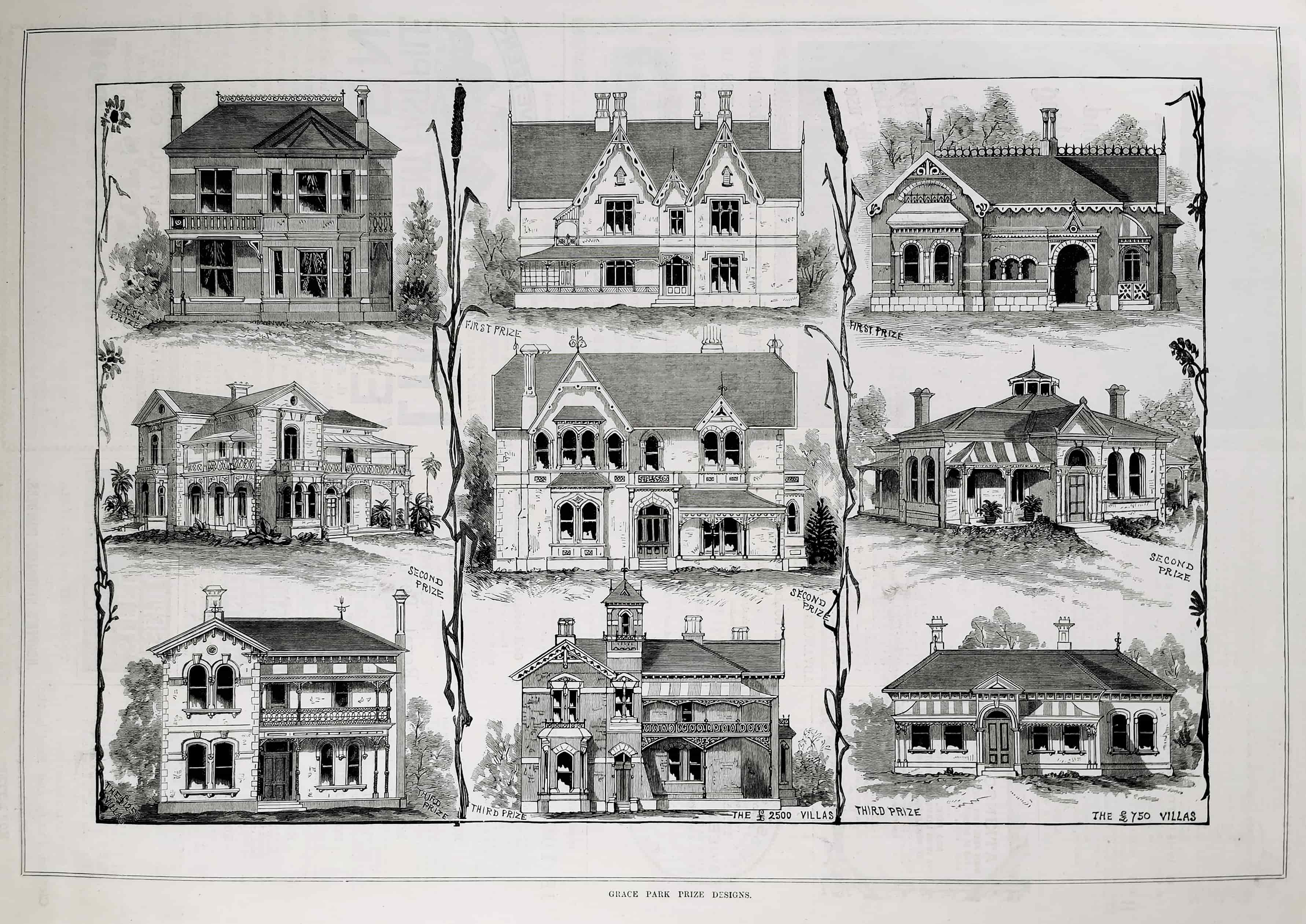 Scarce engraving of the prize winning designs for the Grace Park Estate in 1884. From the original edition of the Australasian Sketcher. Collections: State Library Victoria: Accession Number: A/S 30/6/84/109