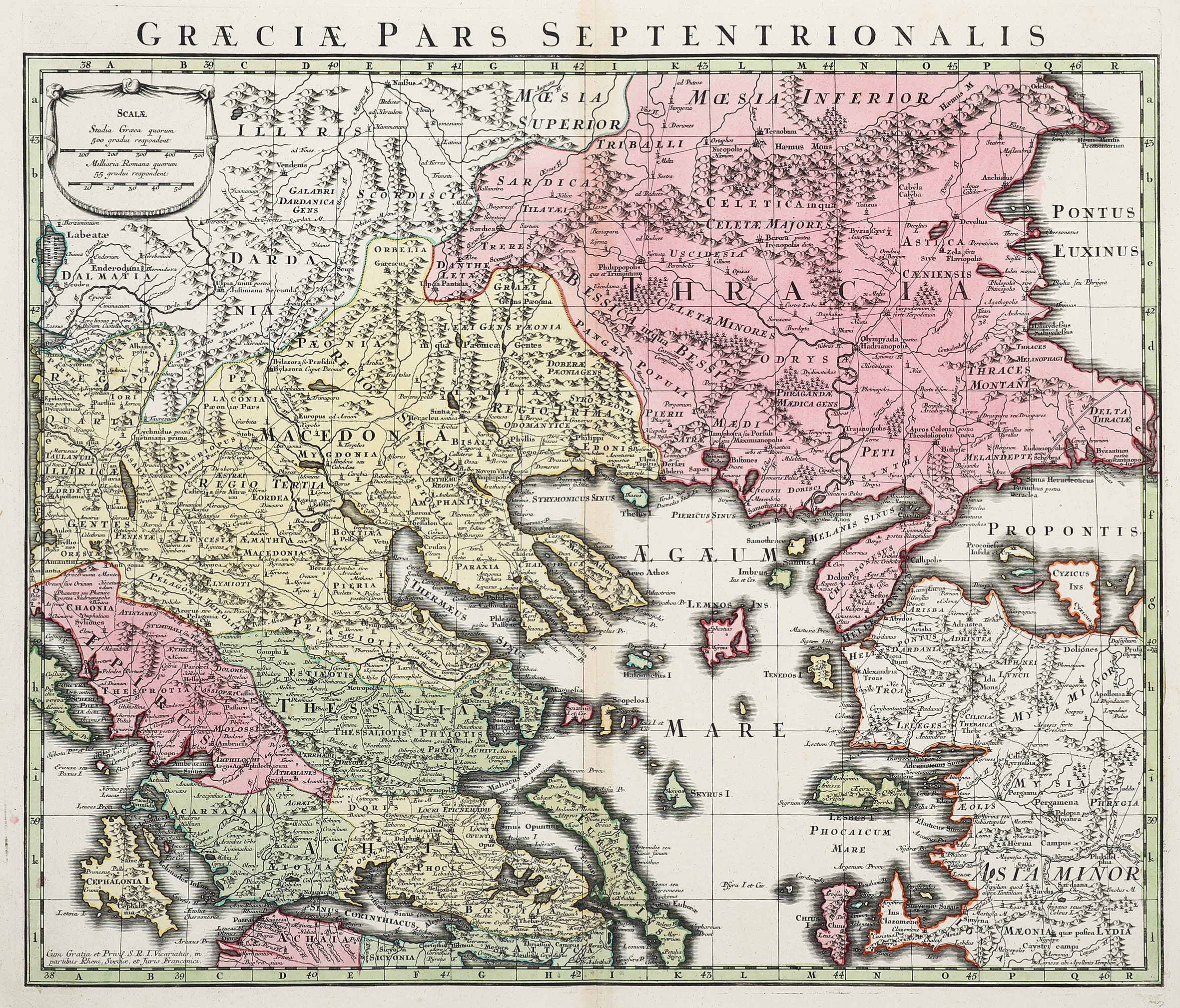 Scarce, c.18th hand coloured copper engraved map of northern Greece by Matthaus Seutter (1678-1756).