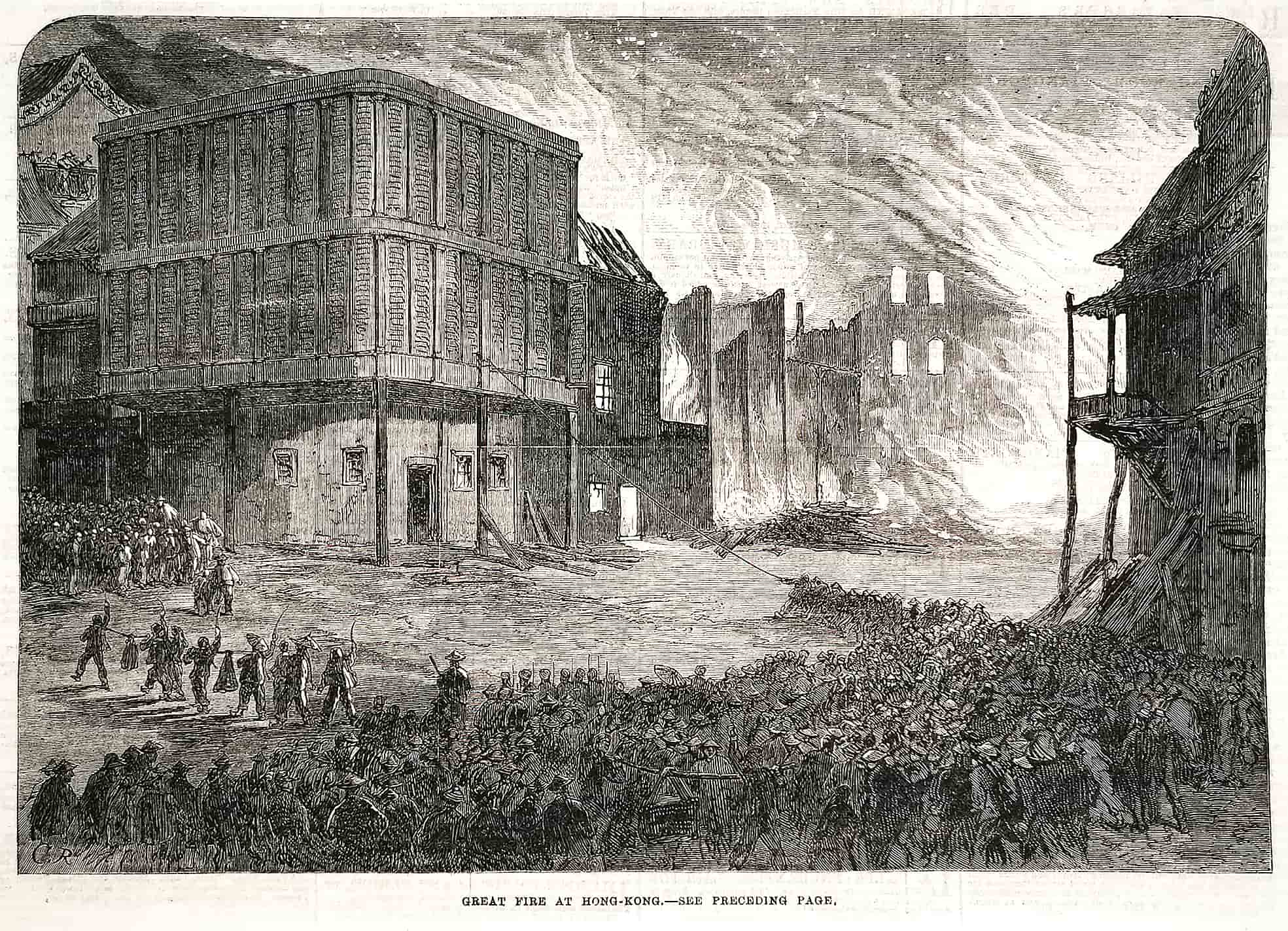 Engraving of the great fire at Hong Kong. From the original edition of The Illustrated London News.