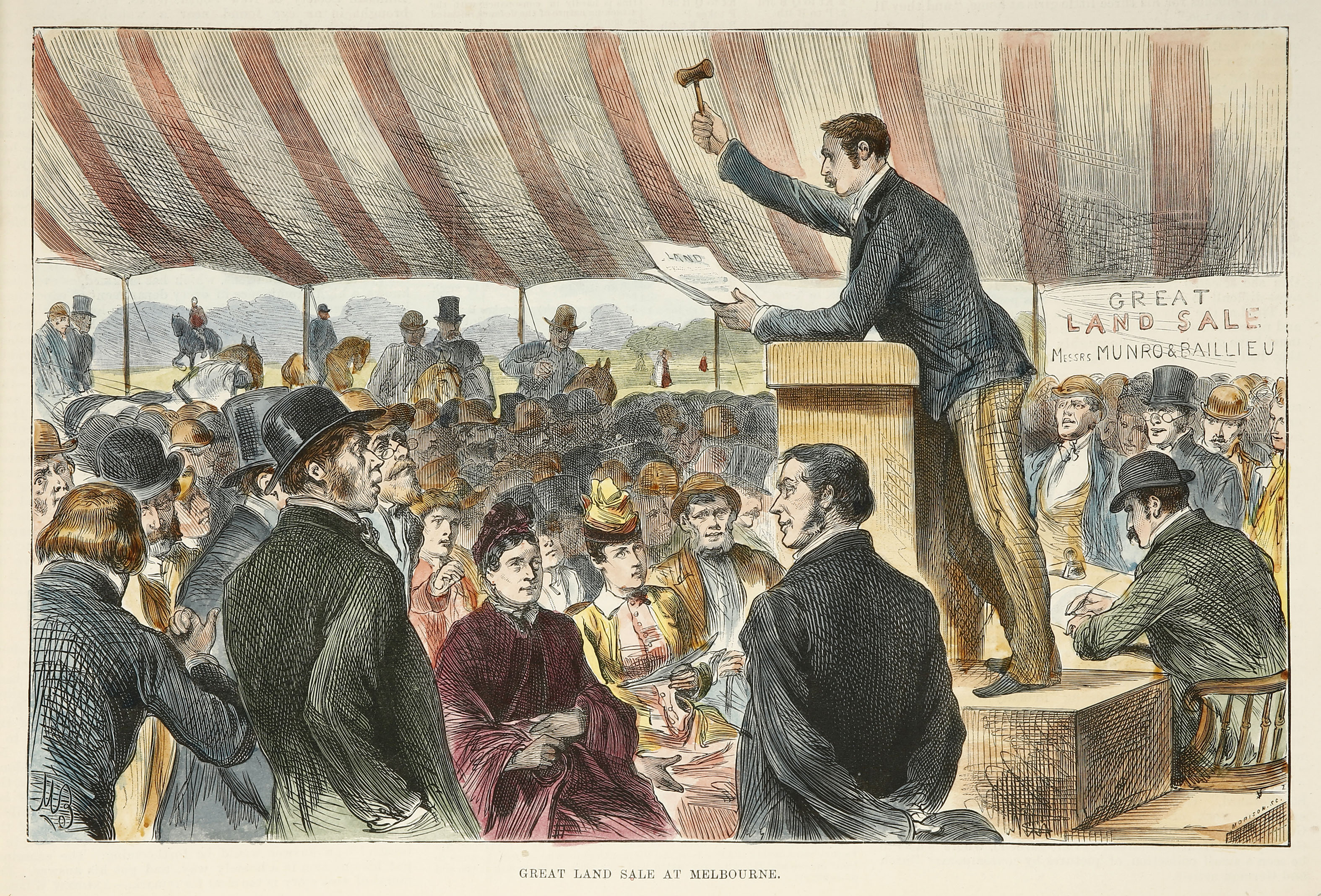 This scarce colonial engraving of an auctioneer selling off blocks in Melbourne. From the original edition of the Illustrated London News.