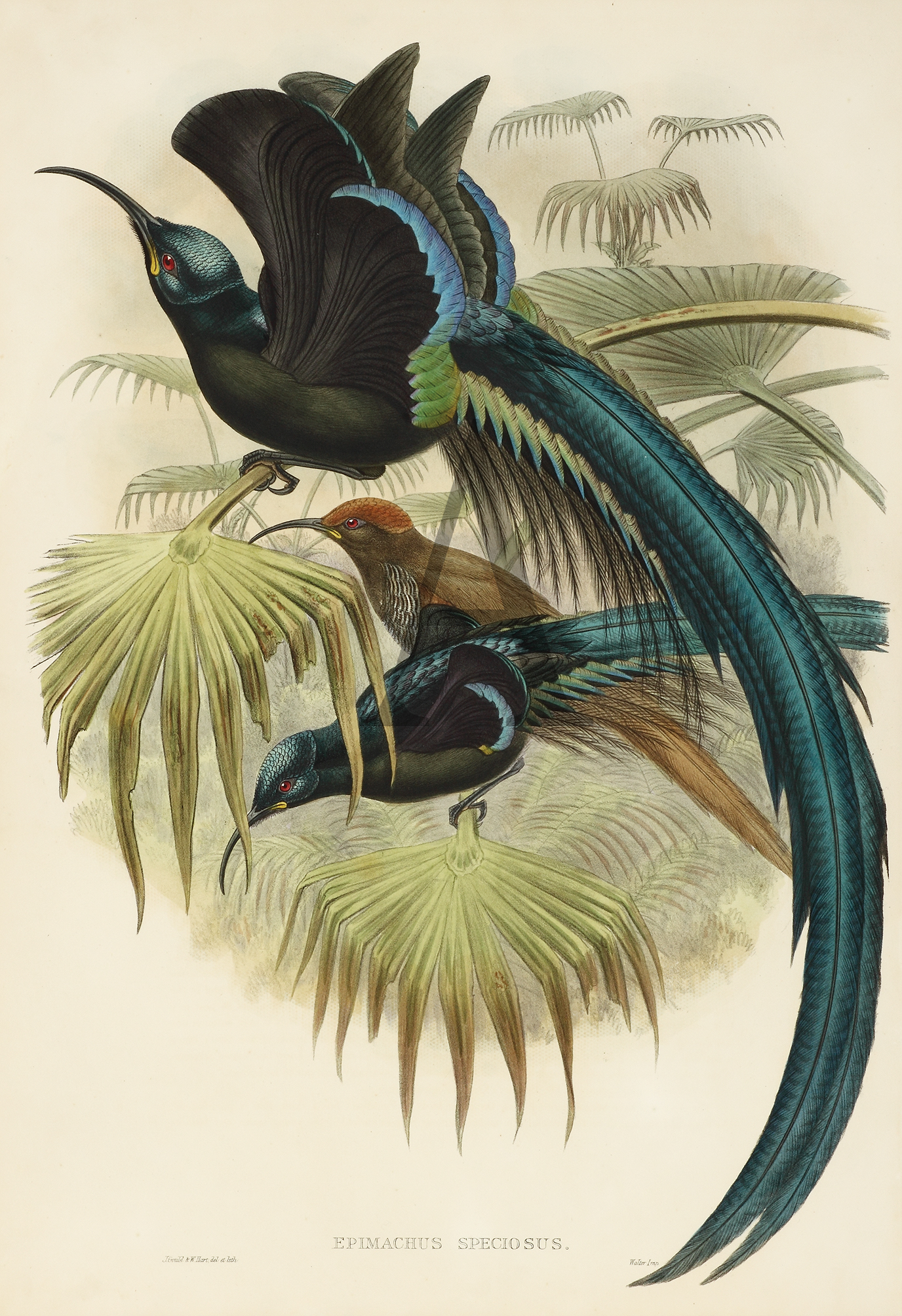 Common name : Black Sicklebill Scientific name: Epimachus fastuosus (hybrid) Described : Hermann 1783 Found in the mountain forests of New Guinea, The male bird has black plumage with an iridescent green, blue and purple scale-like feathers, red iris, bright yellow mouth, long curved black bill, huge sabre-shaped tail and large erectile fan-like plumes on sides of breast. The female is smaller than the male and has a reddish brown plumage with brown iris and buff below. Up to 110 cm in length, the male Black Sicklebill is the longest member of Paradisaeidae. The male is polygamous and performs a horizontal courtship display with the pectoral plumes raised around its head. Sold with the original letterpress description as issued.
