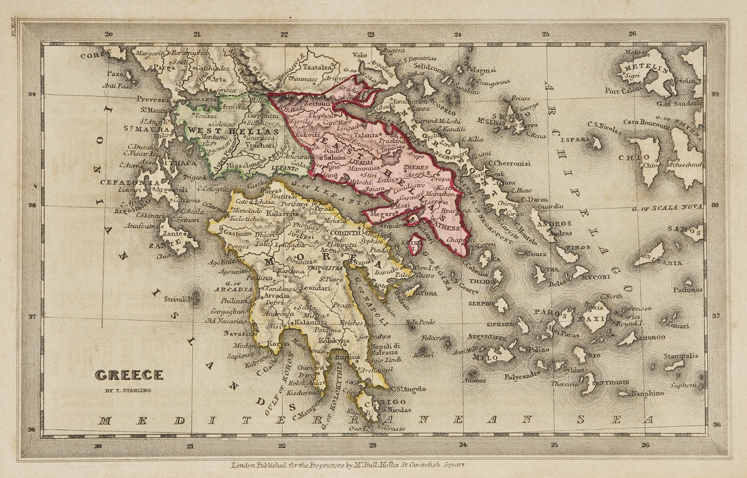 Finely engraved early c.19th miniature map of Greece by Thomas Starling (1796-1850).
