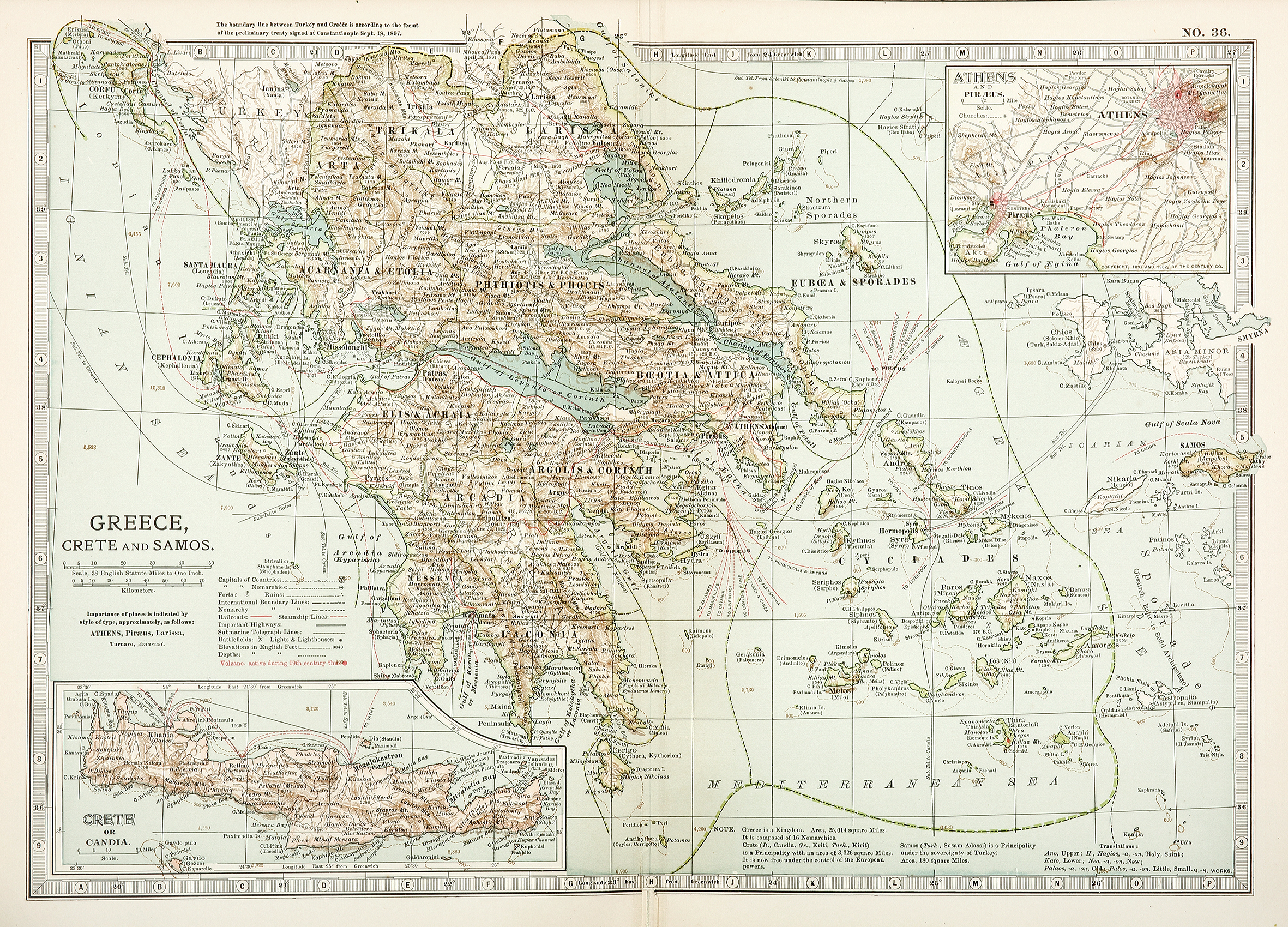 Detailed early c.20th map of Greece with insets of Athens and Crete.
