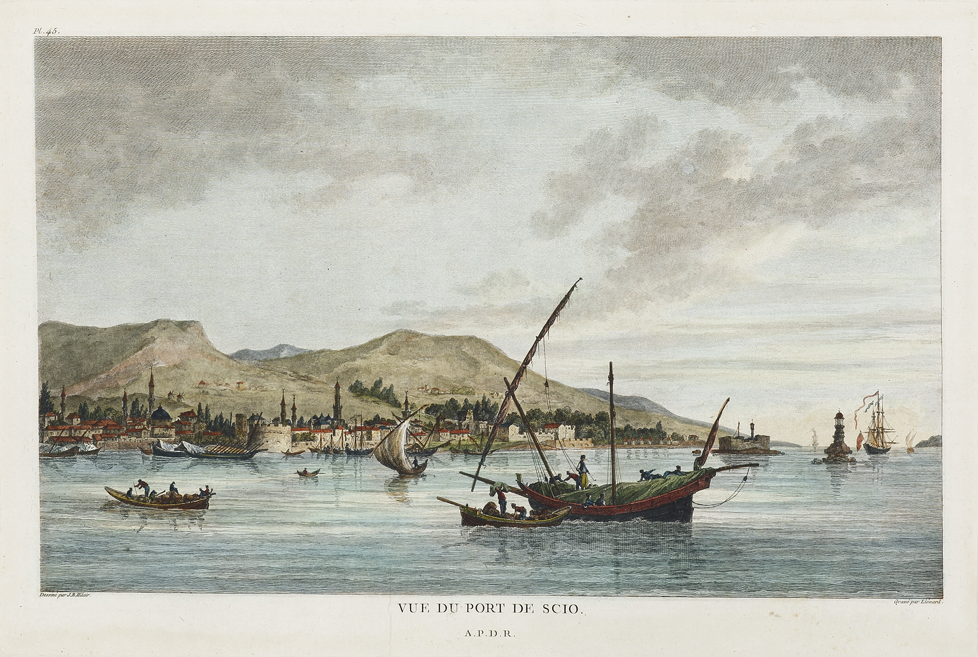 Chios was originally the site of an ancient settlement, the town was first built at the north side of a natural harbour. By the 16th century, the Byzantine walled town had been further fortified by the Genoese rulers into a massive medieval castle, the “Kastro”. The current town has expanded out from the Kastro, and the port in the last 200 years. After the devastating earthquake of 1881, the town was substantially rebuilt in neoclassical style. The view is from one of the most celebrated of all the published works on Greece which established the model for later publications of Voyages pittoresques.