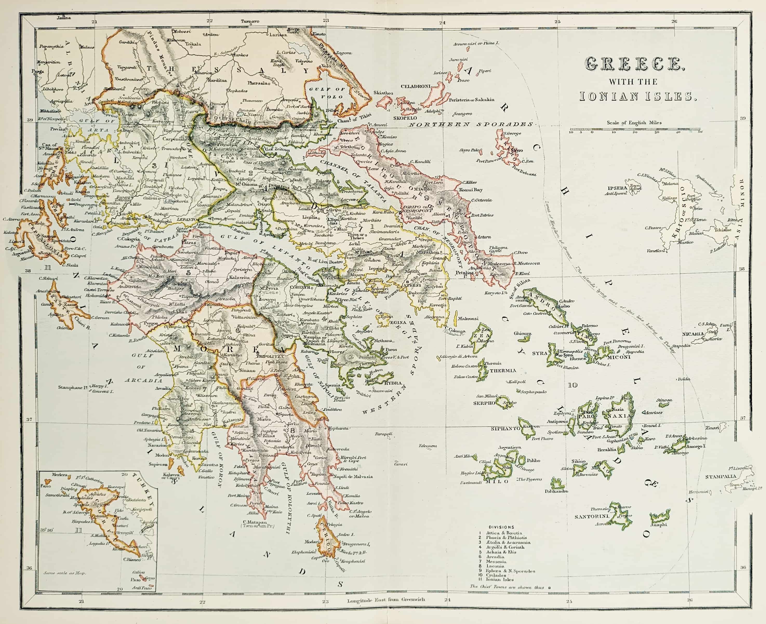 Detailed c.19th map of Greece and the Ionian Islands divided into divisions in colour and with an inset of Corfu.