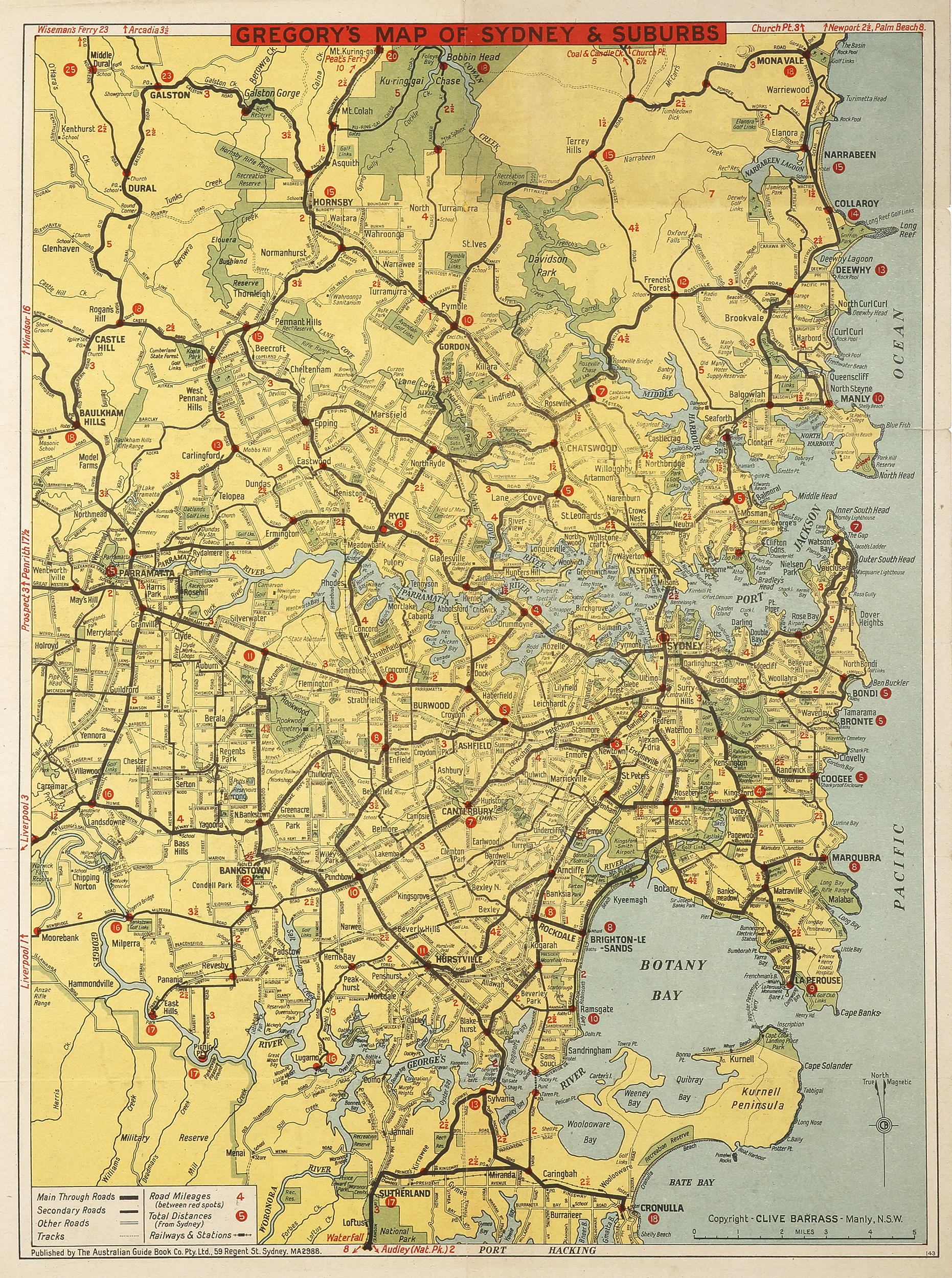 C.20th map of Sydney extending from Mona Vale south to Cronulla, published by The Australian Guide Book Co., Pty. Ltd., 59 Regent St., Sydney.