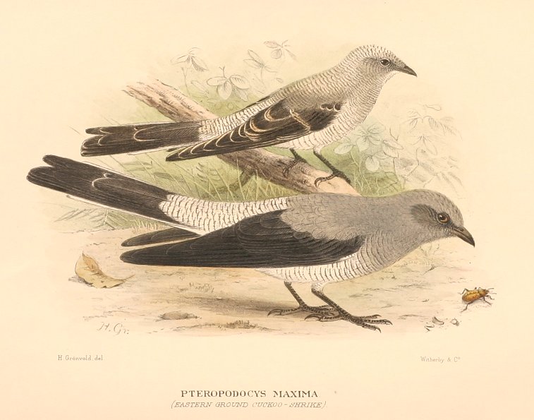 Ground Cuckooshrike, Coracina maxima. Distribution: Mainland Australia.  First described by Ruppell Mus. Senckenb. 1839.  This image is from the last great bird series, The Birds of Australia by G. Matthew’s and is rarer than John Gould’s work on Australian birds, … Read Full Description