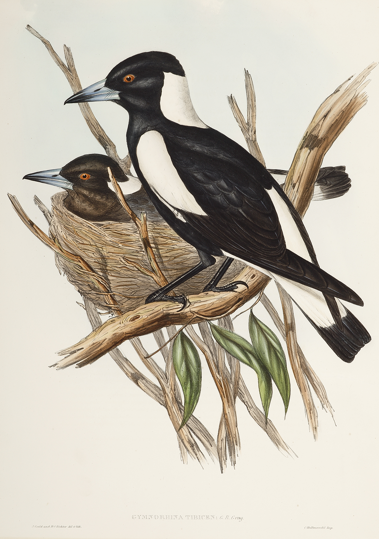 Rare lithograph of the best and largest colonial image of the Australian Magpie by John Gould from his epic series, The Birds of Australia and Adjacent Islands, published for the author, printed by Richard and John E. Taylor, London.