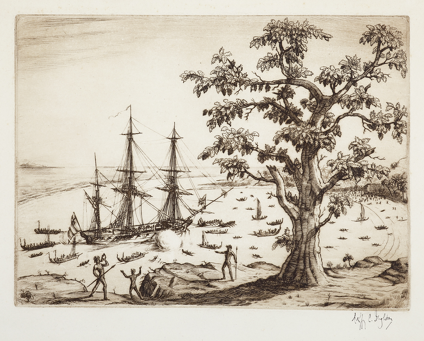 Fine etching by the maritime historian and etcher of the H.M.S. Dolphin arriving at Tahiti, 24 June, 1769 under the command of Captain Samuel Wallis. At daybreak they found themselves confronted by more than 150 canoes – the Dolphin had in fact arrived at the island of Tahiti, which Wallis named King George’s Island.