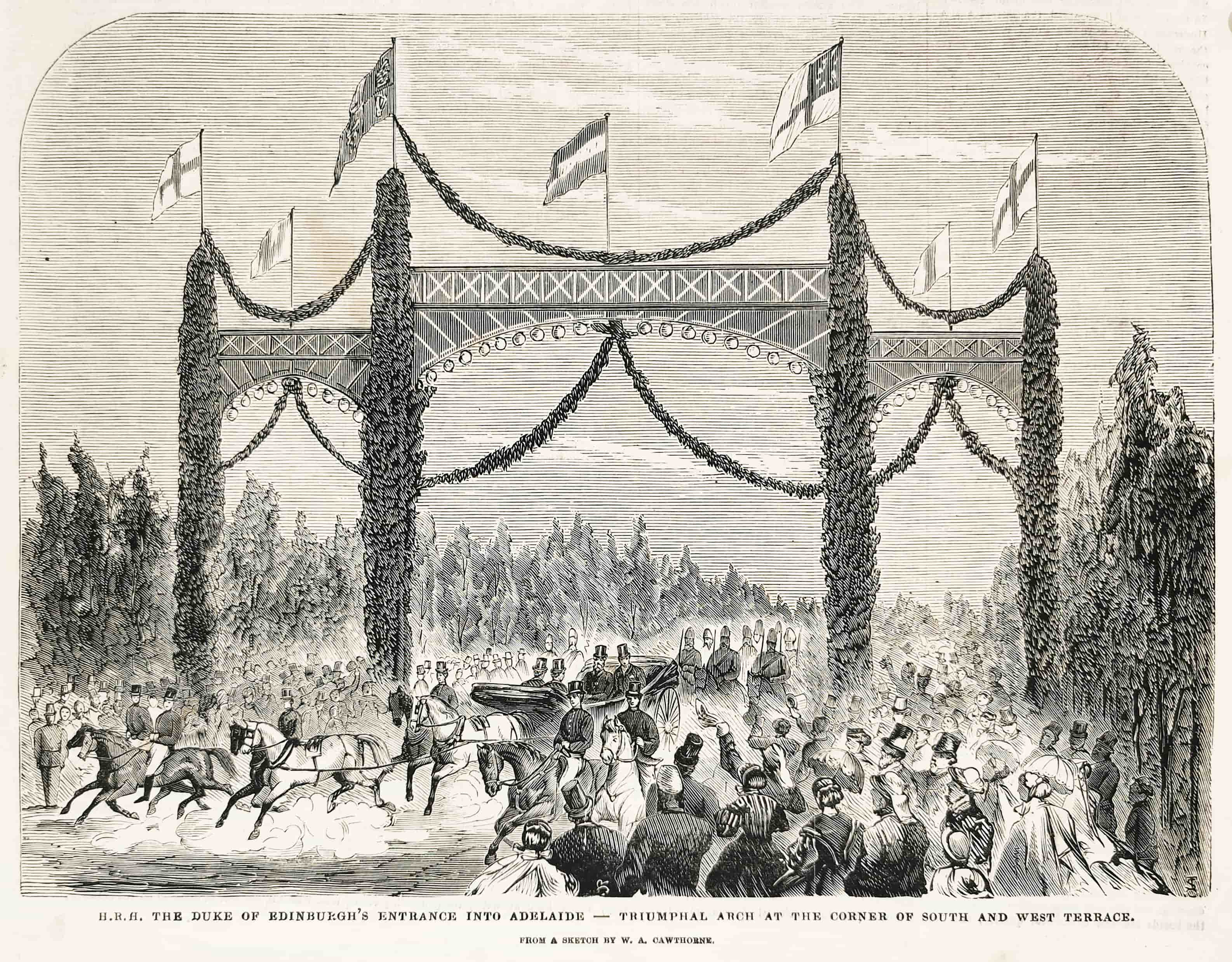 Scarce engraving of the Duke of Edinburgh’s carriage passing under the triumphal arch on the corner of South and West Terrace, Adelaide. Prince Alfred, Duke of Edinburgh, son of Queen Victoria, on the Galatea reached Adelaide on 31 October 1867 to commence the first royal tour of Australia.