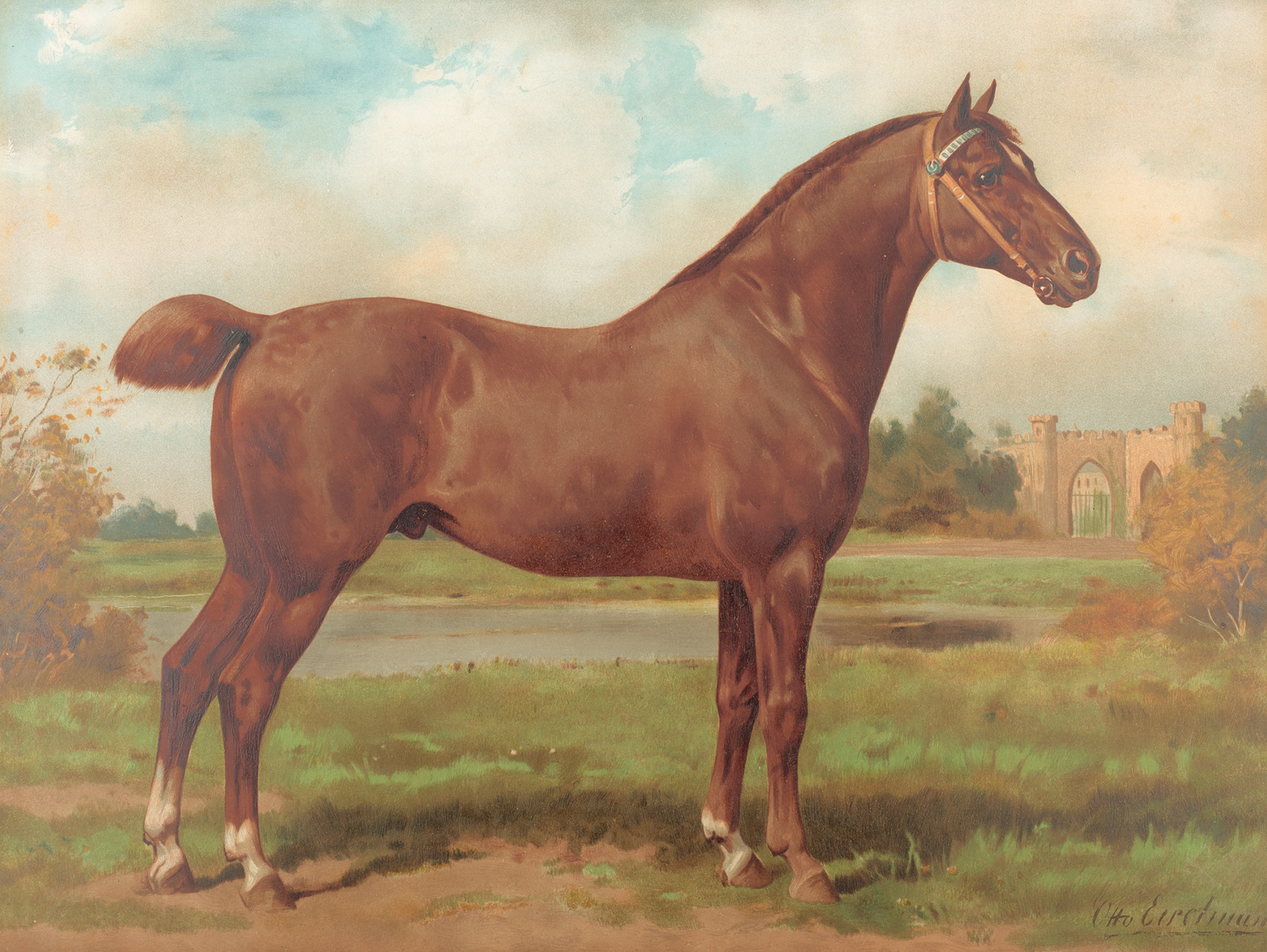 Stunning large portrait of a Hackney horse. The lithographs were printed on textured paper to look like oil paintings.
