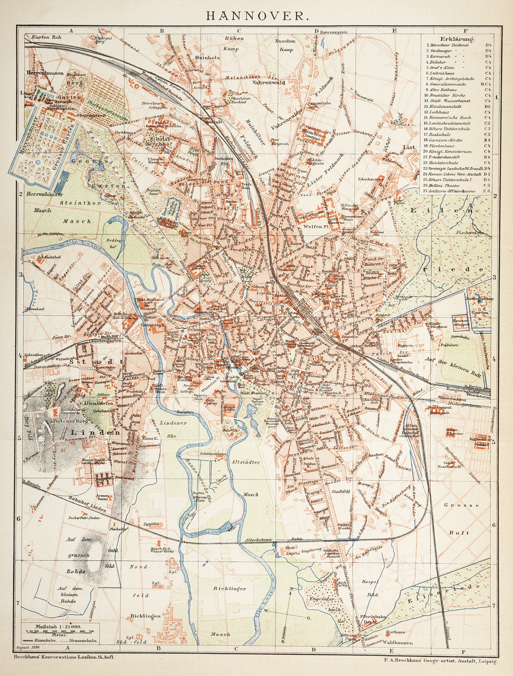 Detailed c.19th map of the city of Hannover. From Brockhaus, F.A. Konversations Lexikon. Collections: National Library Australia: Bib ID 1104411