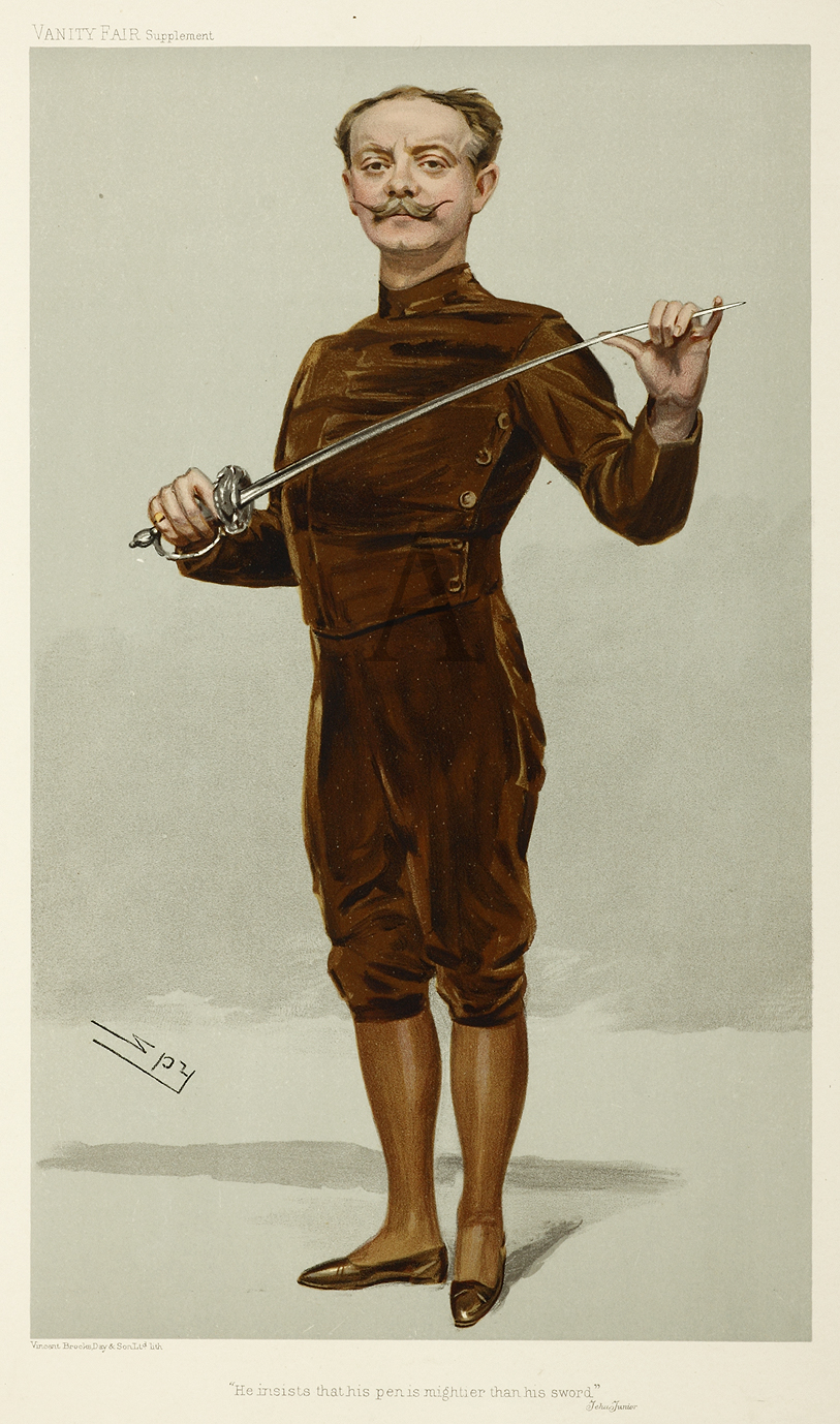 Original Vanity Fair caricature of Mr Egerton Castle (1858-1920) was a Victorian author and swordsman. He was an early practitioner of reconstructed historical fencing, frequently in collaboration with his colleague Captain Alfred Hutton. Castle was the captain of the British épée and sabre teams at the 1908 Olympics.