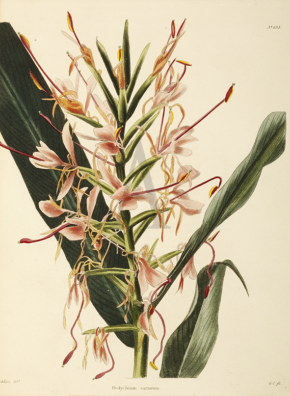 Fine early botanical engraving from the famous series, The Botanical Cabinet, produced by the Loddiges family who had one of the most notable plant nurseries during the end of the C18th and early C19th. Their nursery traded and introduced many exotic plants, trees, shrubs, ferns, palms and orchids from the Americas, Africa and Australia into British and European gardens. As part of their success they were encouraged to produce a “catalogue” of their plants which they named the The Botanical Cabinet and became one of the most influential botanical series produced during the great era of plant collecting.