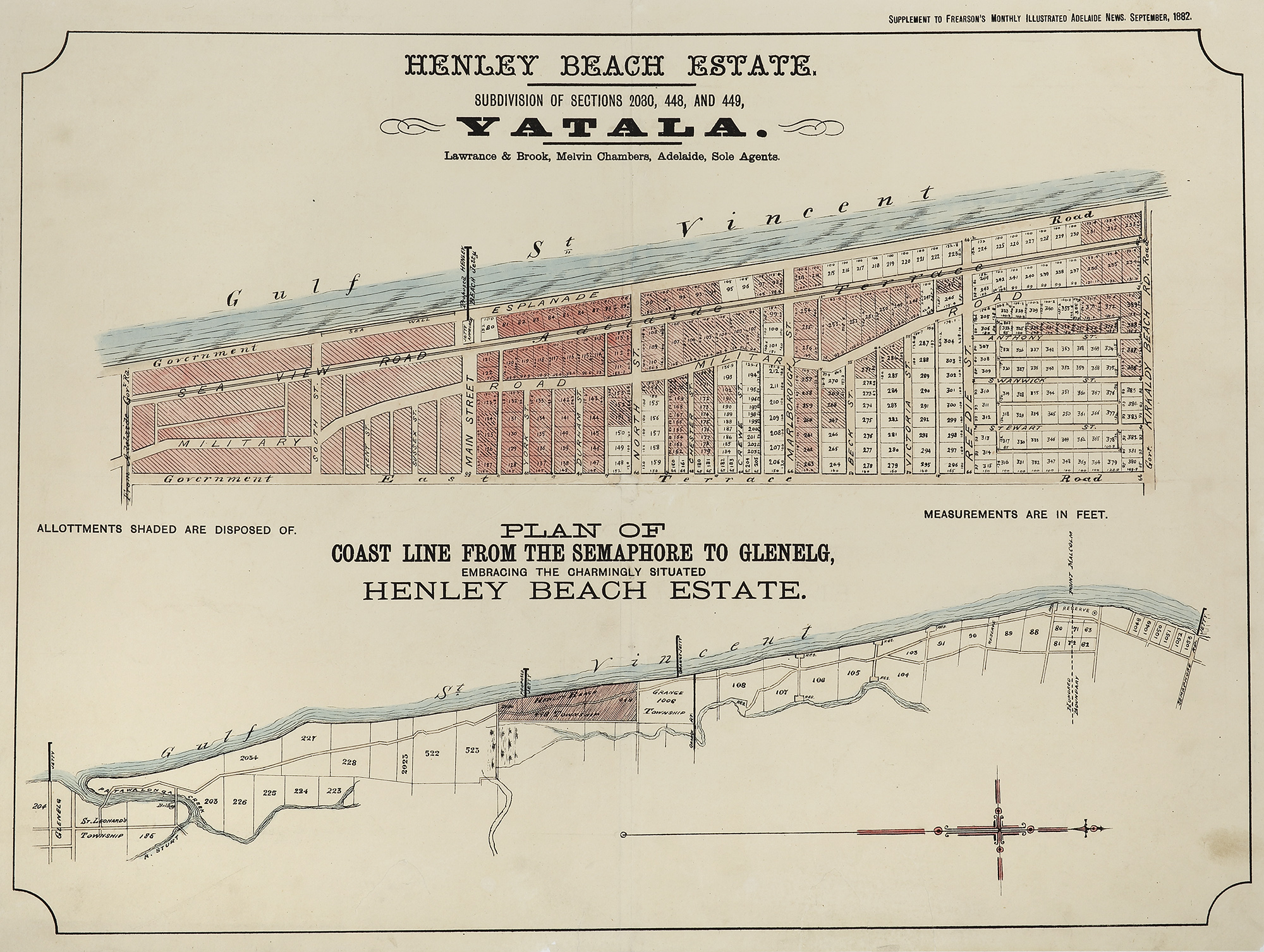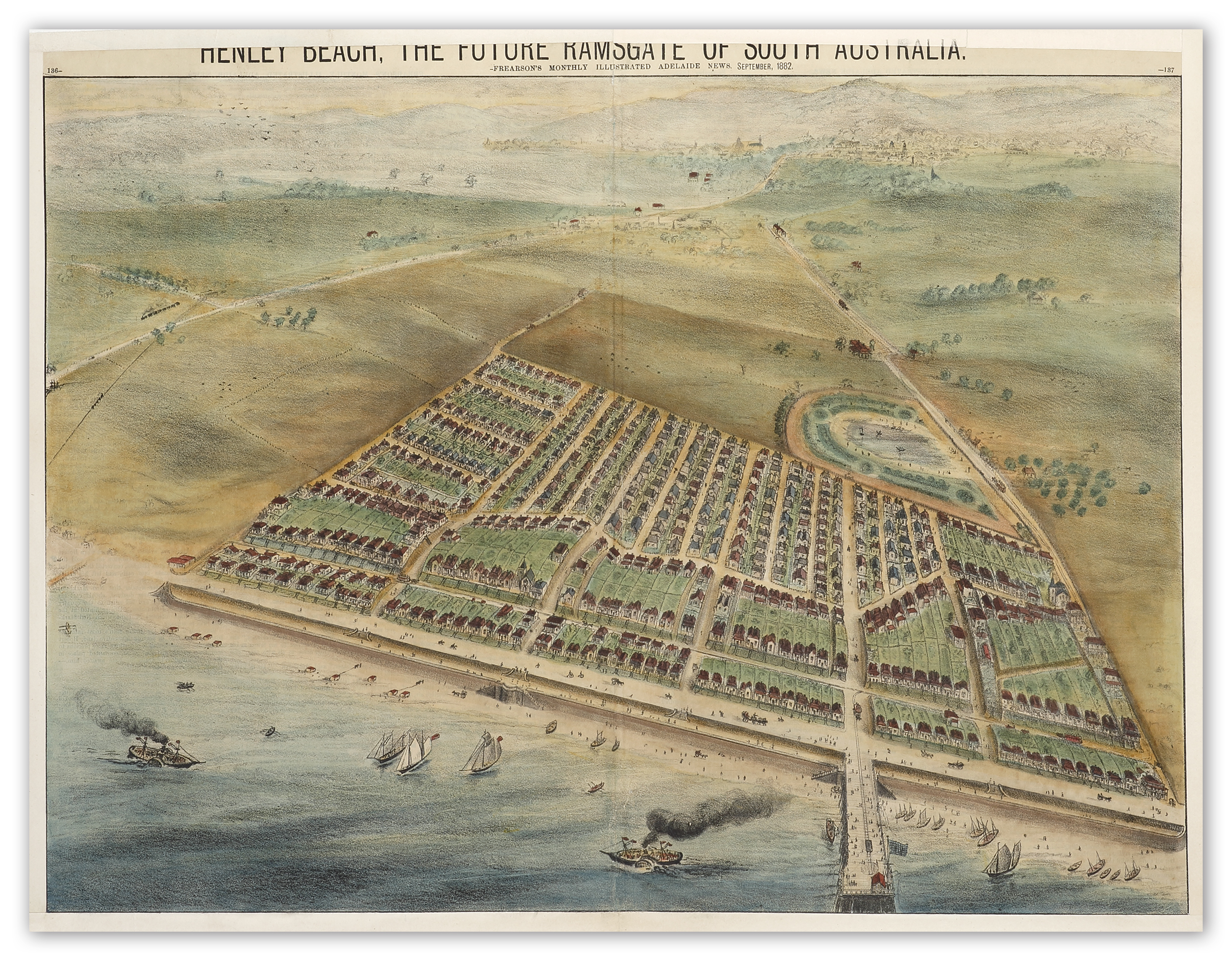 Extremely rare c.19th panorama and plan of Henley Beach, South Australia made to promote the Henley Beach Estate subdivision of sections 2030, 448, and 449, Yatala which were advertised for sale on September 1882, with the sole agents being Lawrence & Brook, Melvin Chambers, Adelaide. The suburb was promoted as the Future Ramsgate of South Australia.