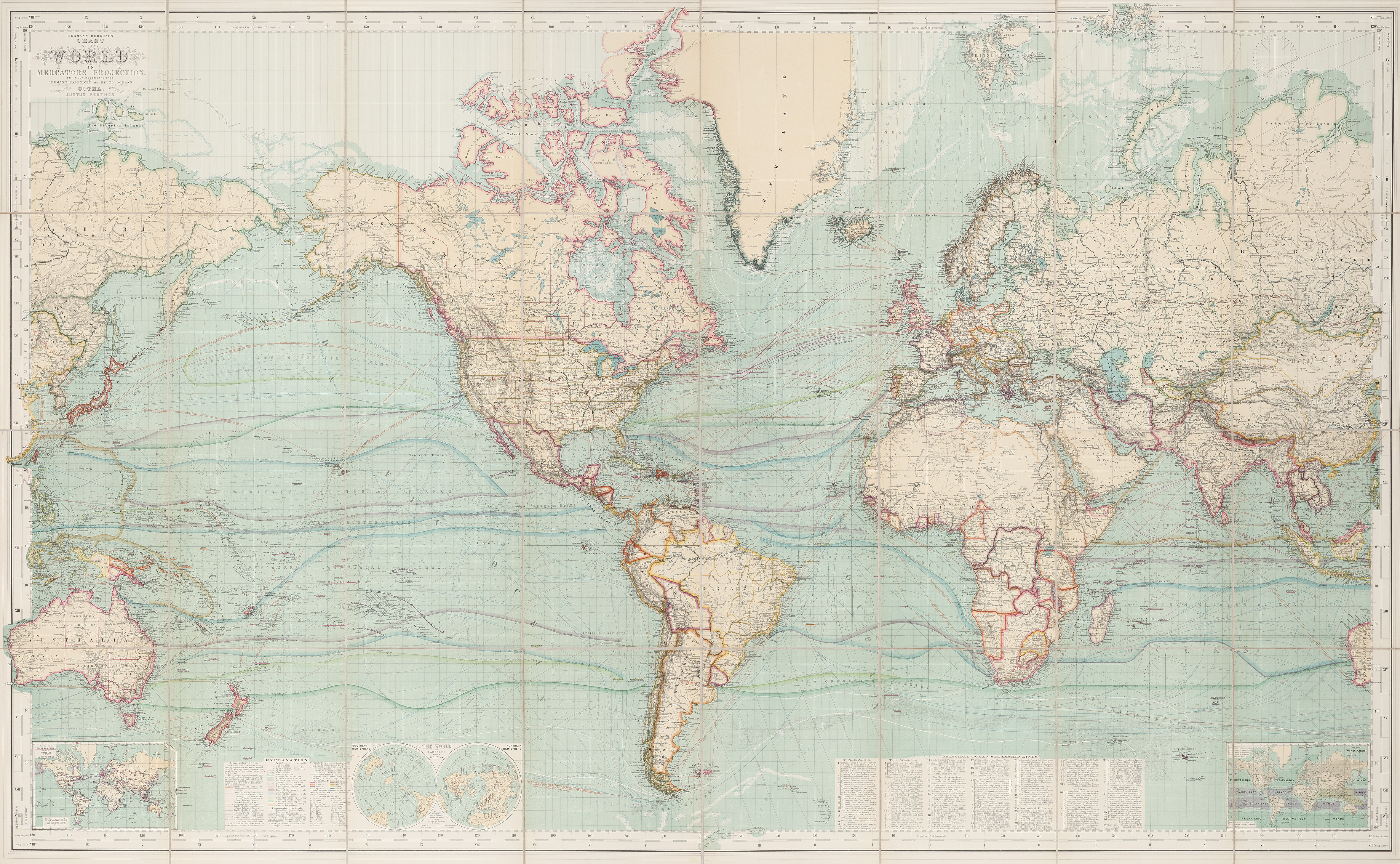 Published by the renowned geographical institute of Justus Perthes in Gotha, this twelfth edition represents a complete revision of Berghaus’s celebrated world chart, undertaken after his death by Herman Habenicht and Bruno Domass. Reflecting the latest cartographic and geographical knowledge of the late nineteenth century, it incorporates updated political boundaries, oceanic routes, and recent discoveries. A fine example of late nineteenth-century German scientific cartography, notable for its precision, clarity, and high production standards characteristic of the Perthes publishing house.