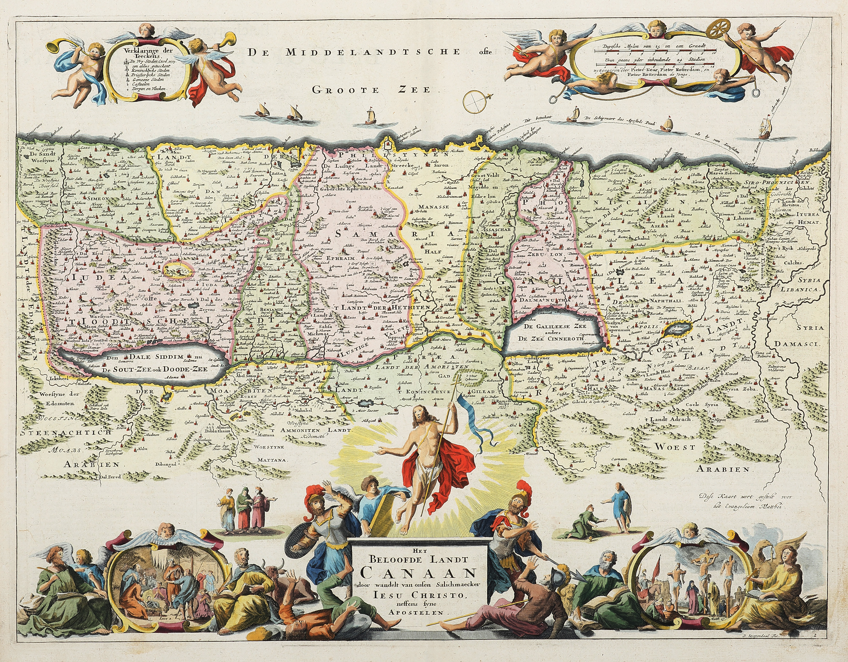 The map extends from the Mediteranean to he Jordan River. The map is embellished with a key at top left and a scale at top left both embellished with putti and a lower map area a series of scenes depicting the Nativity, Jesus and the Crusifixation.