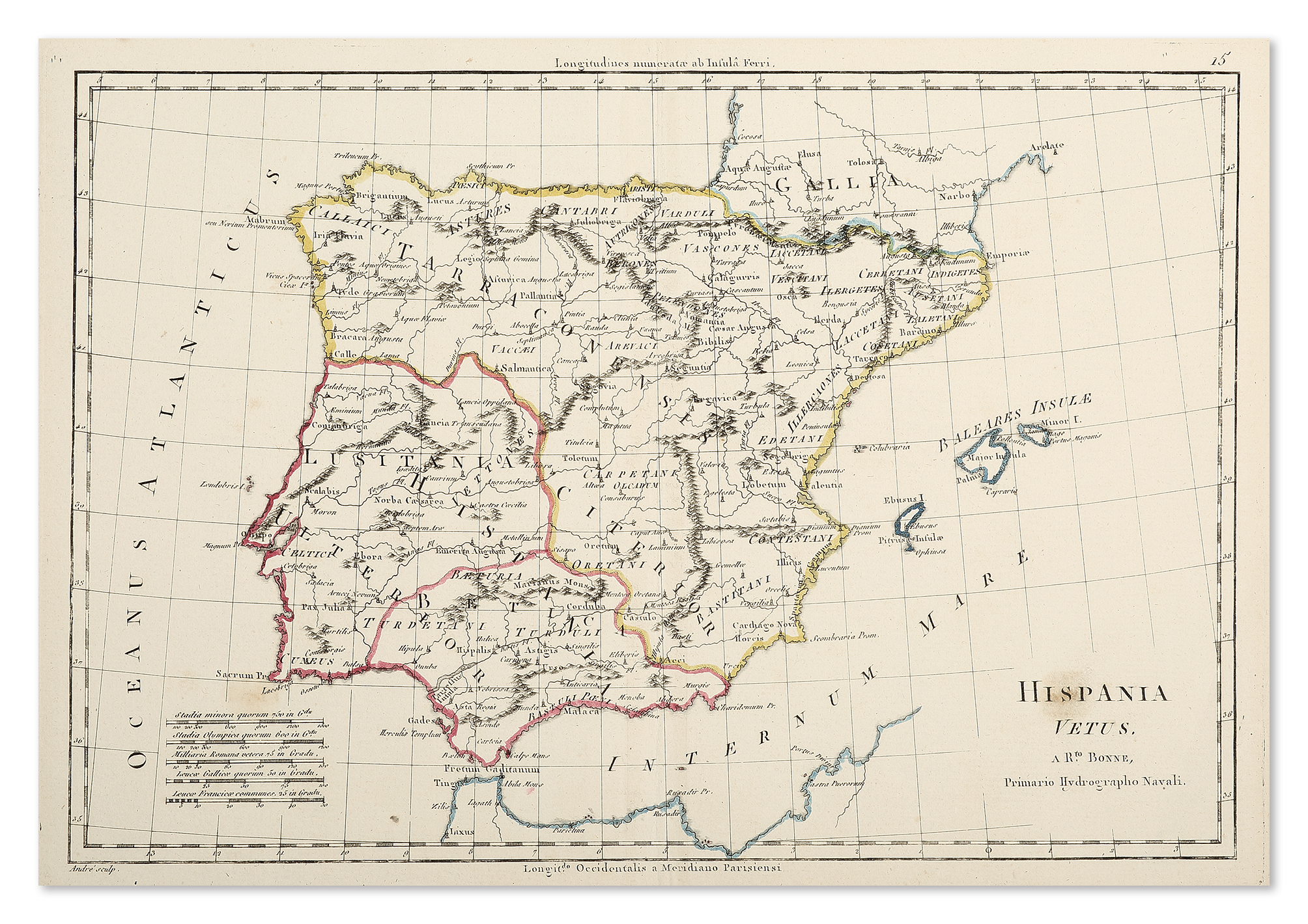 Scarce map of Spain. From Bonne’s, Atlas Encyclopedique, Contenant La Geographie Ancienne, et Quelques Cartes sur La Geographie du Moyen Age, La Geographie Moderne, et les Cartes Relatives a la Geographie Physique.