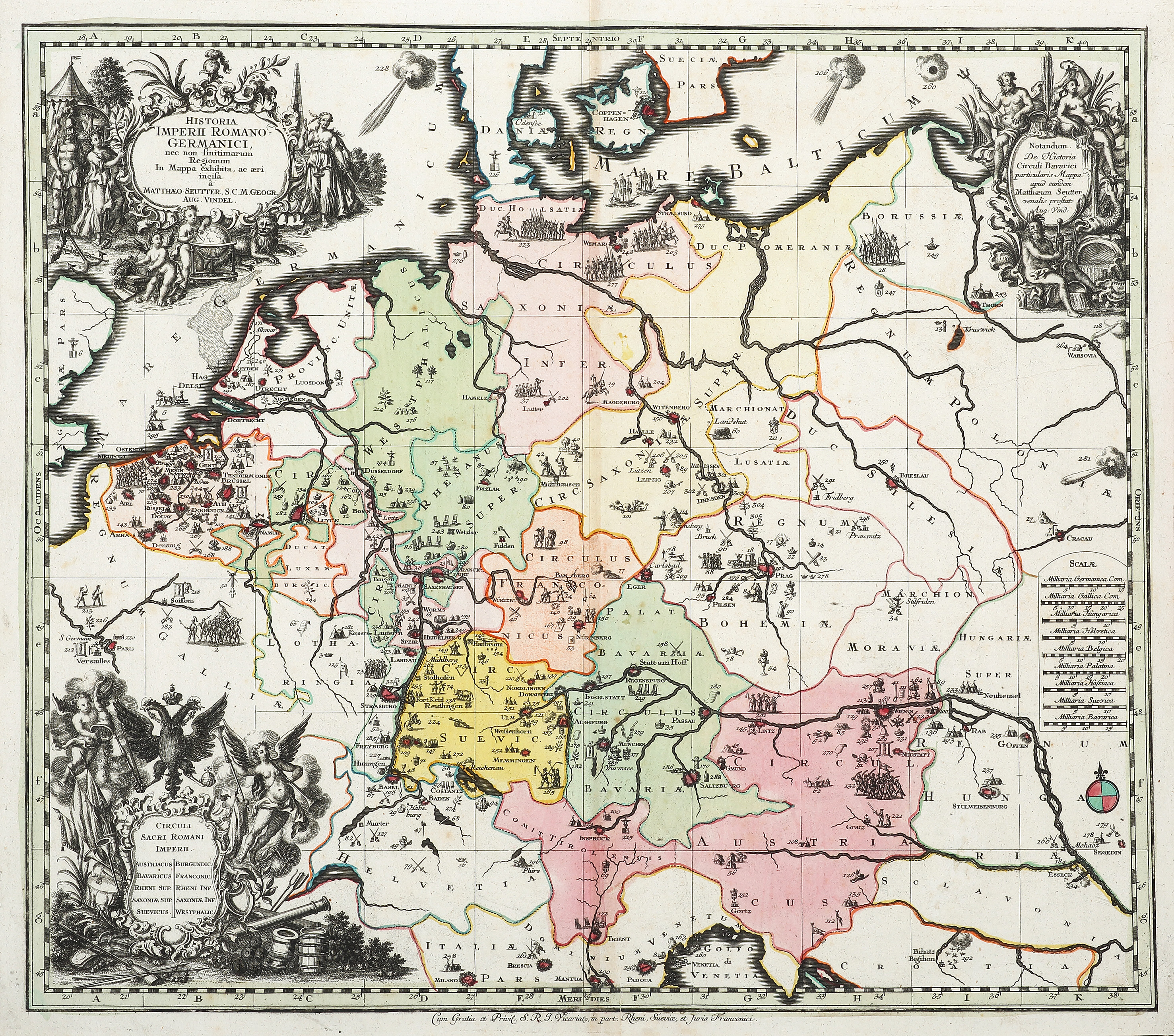 Rare, superbly embellished c.18th hand coloured engraved map by Matthaus Seutter of Germany during the Roman Empire.