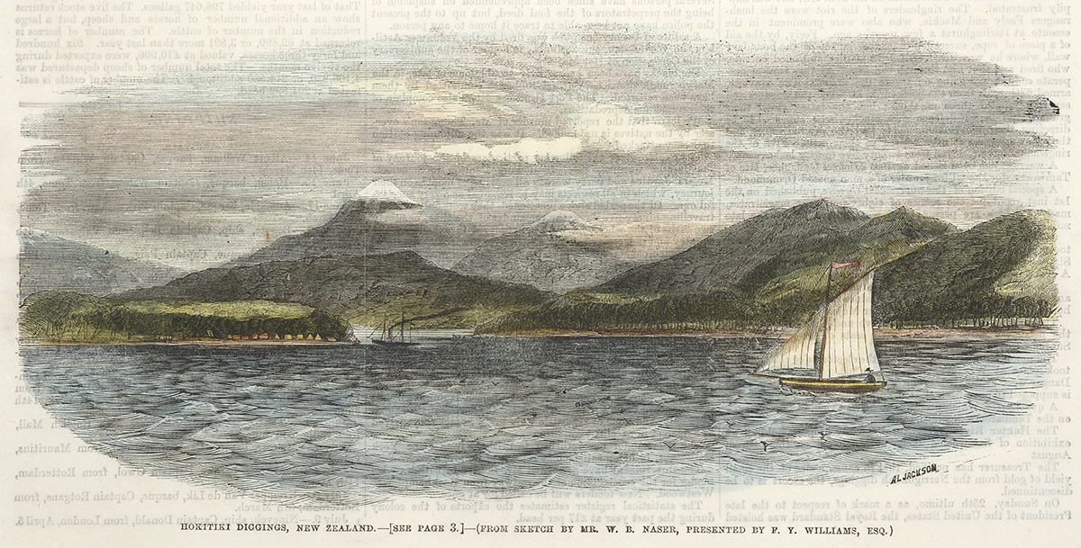 Rare engraved view of Horiatiki on New Zealand’s west coast. In 1864, two Māori named Ihaia Tainui and Haimona Taukau, discovered gold near the Taramakau River. The following year, gold was also found in other locations, including Okarito, Bruce Bay … Read Full Description