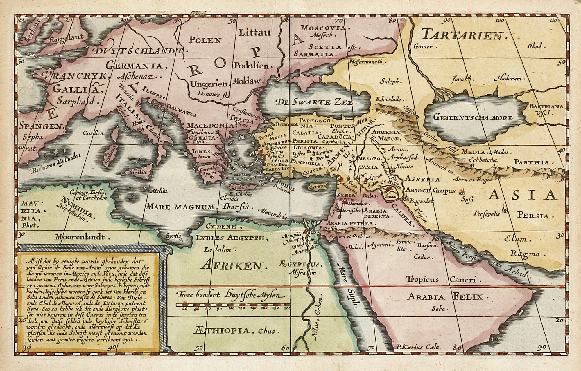 Scarce c.17th Dutch map showing the Holy Land when the children of Israel lived there from Heinrich Bunting’s famous classic account of biblical travel. Translation of first few lines of lower left text panel: Al has come from several words … Read Full Description