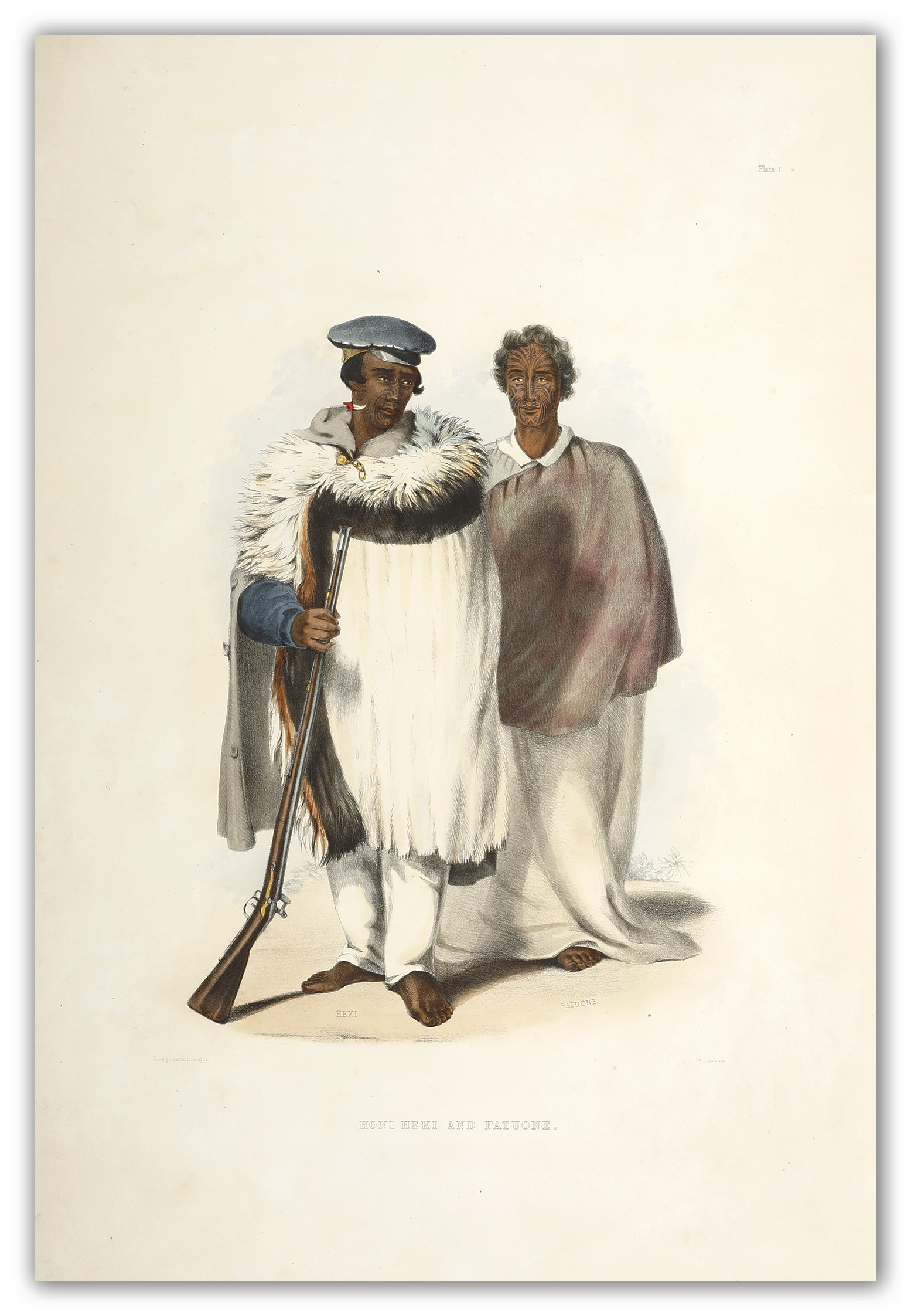 Famous lithograph by George French Angas of two of the most import Maori chiefs; Honi Heke and Eruera Maihi Patuone (1764-1872). This is plate number one in Angas’s series and is rarely found in good condition.