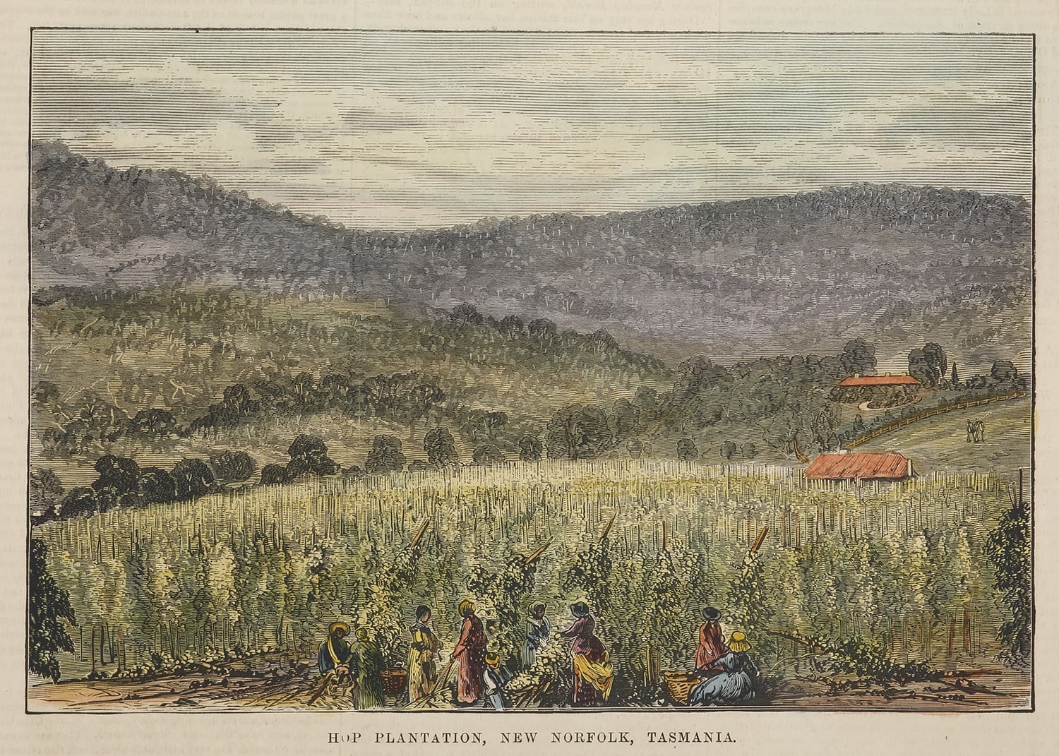 Scarce engraved colonial engraving hop plantation at New Norfolk, Tasmania. From the original edition of the Australasian Sketcher. Collections: National Library Australia: Bib ID 914558 State Library New South Wales: REF1/MAV/FM4/9236-9239 State Library Victoria: PCINF ; AS 17-02-77 P.181