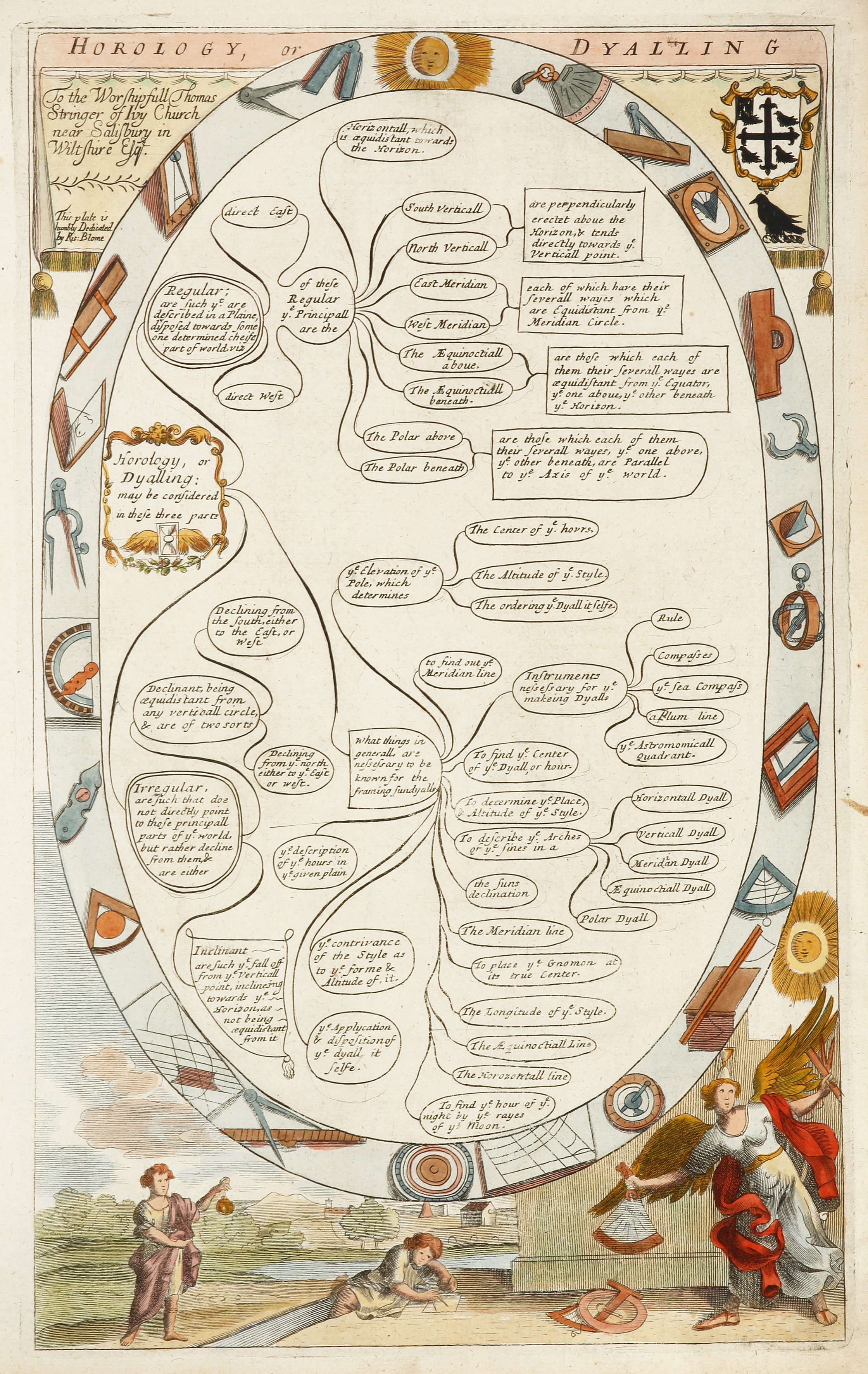 Rare engraving of Horology from Blome’s, The Gentleman’s Recreations: In Three Parts. The Full Part contains A Short and Easie Introduction to all the Liberal Arts and Sciences, & The Second treats of Horsemanship, Hawking, Hunting, Fowling, Fishing, Agriculture, & Done from the most Authentick Authors.
