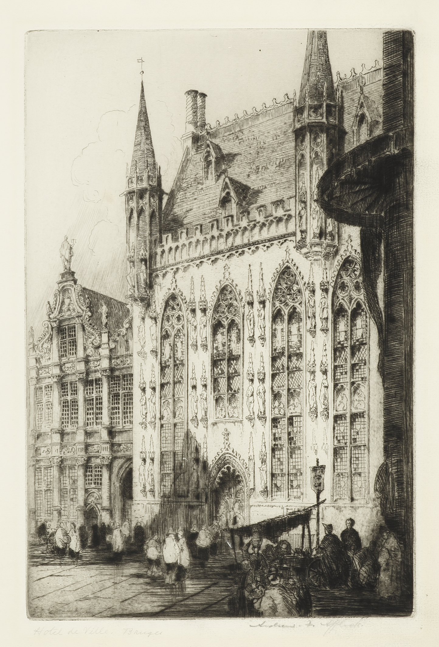 Fine etching by Andrew Fairbairn Affleck (1874-1935) of the Stadhuis van Brugge (Hôtel de ville de Bruges) – Brugge, Belgium.