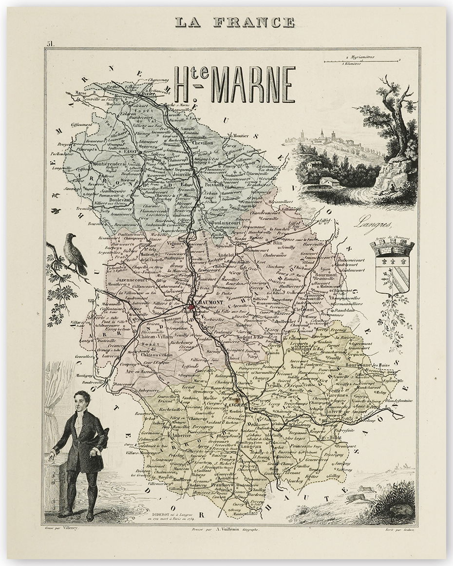Decorative C19th map of Hte Marne with numerous vignettes including a view of Langres and a portrait of Diderot, a French philosopher, art critic, and writer, best known for serving as co-founder, chief editor, and contributor to the Encyclopédie along with … Read Full Description