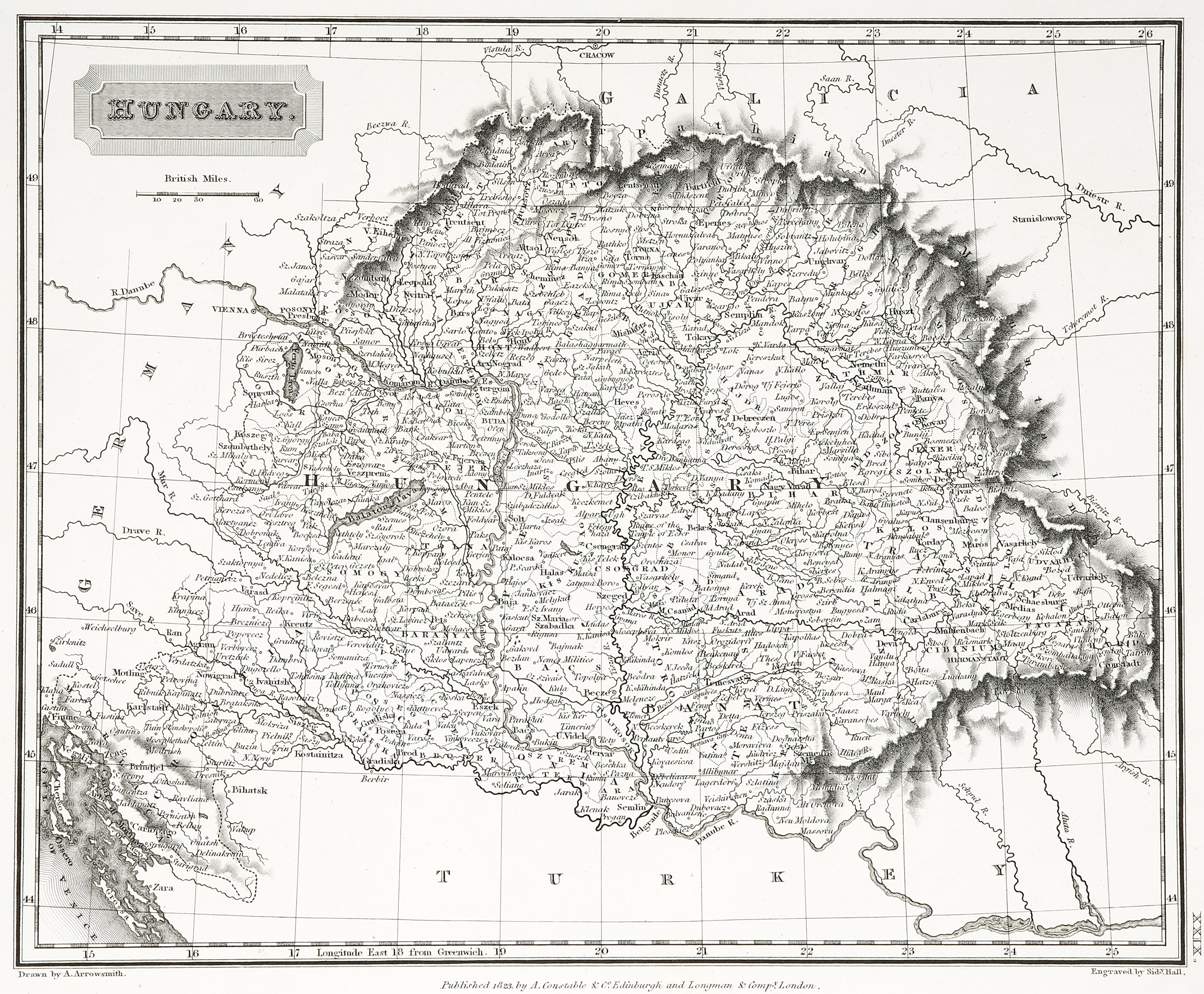 Detailed early C19th map of Hungary, by Aaron Arrowsmith, from the greatest English mapmaker of the late C18th. From Arrowsmith, A new general atlas.