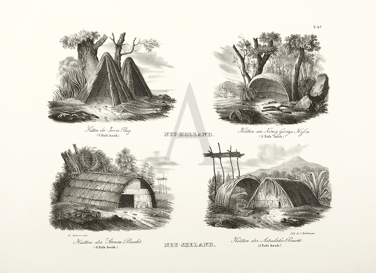 Fine scarce lithograph of Jervis Bay and King George aboriginal huts, based on De Sainson’s issued in the record of Dumont D’Urvilles voyage of exploration.