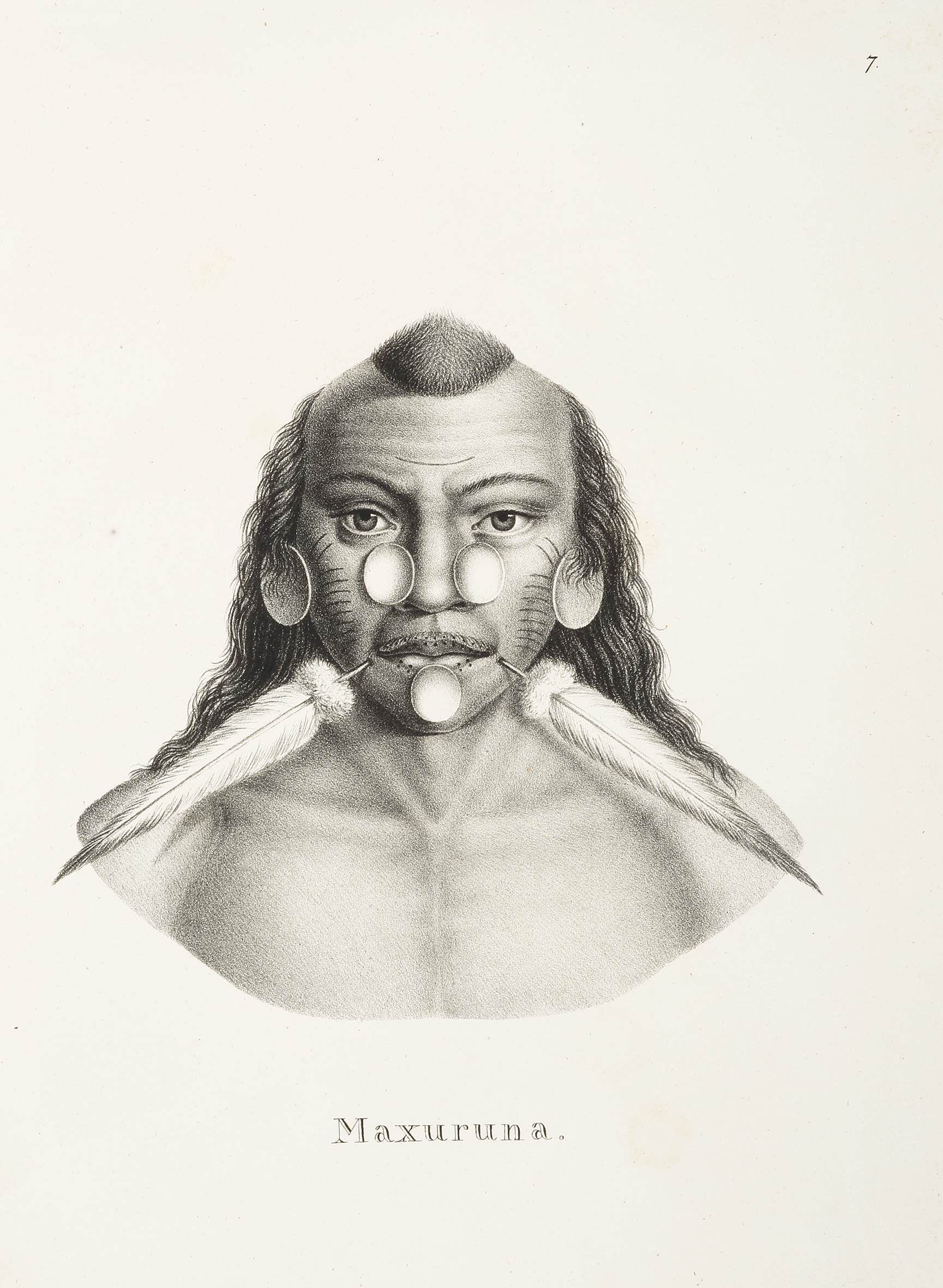 Fine scarce lithograph of the chief of the Maxurana tribe, Javari river, Brazil. First issued in the accounts of Johann Baptist von Spix (1781-1826), voyage to Brazil. In 1815 Spix, botanist Carl Friedrich Philipp von Martius (1794-1868), and several other naturalists were selected to take part in an official Austrian expedition to Brazil.