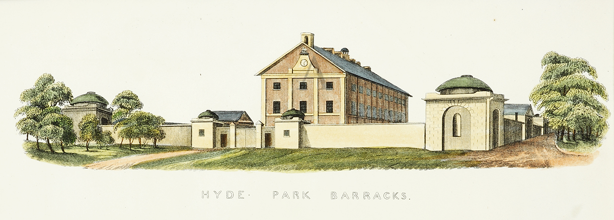 Scarce, hand coloured c.19th engraving of Hyde Park Barracks.