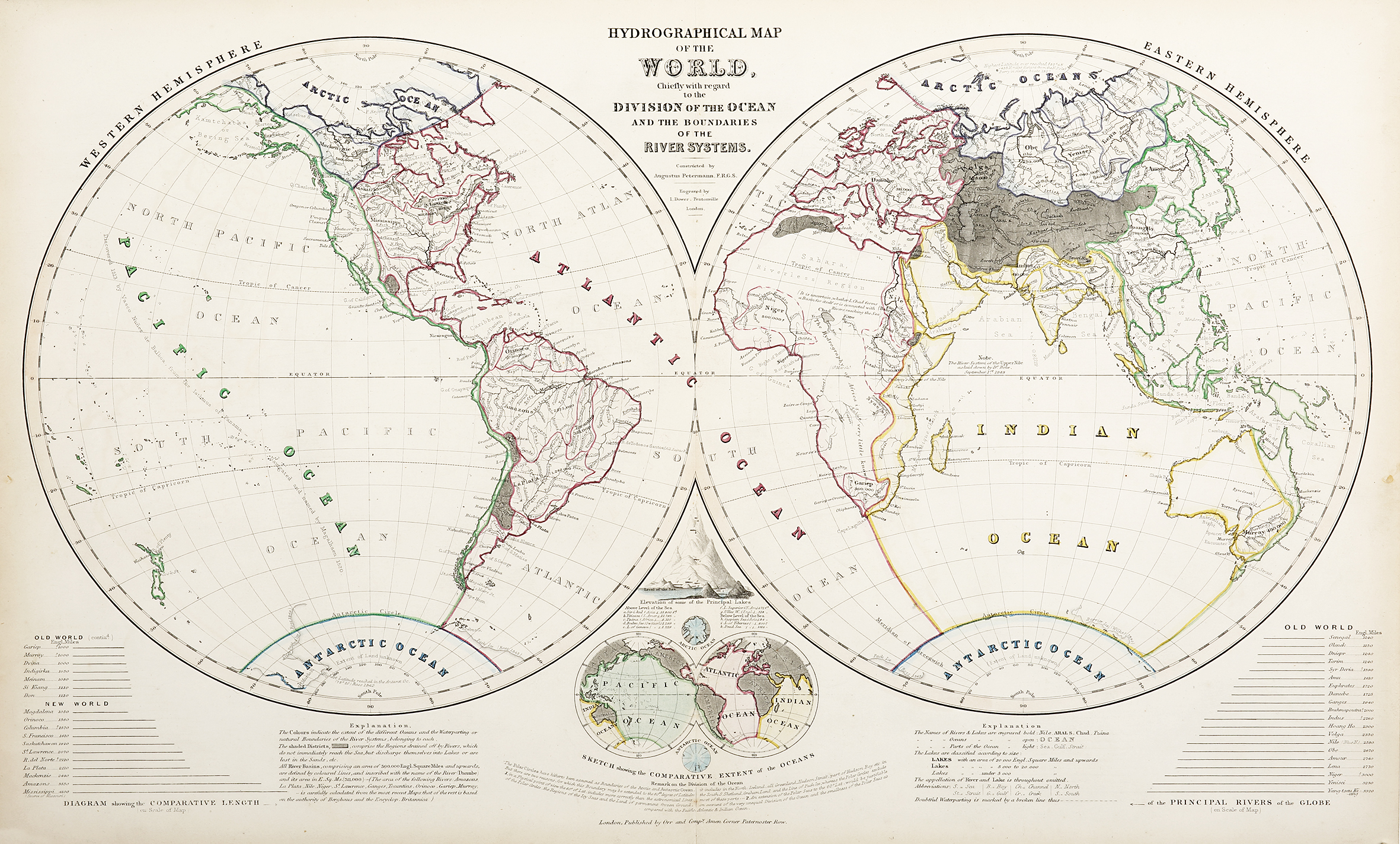 Detailed c.19th world map showing the boundaries of the oceans and main rivers. A small double hemisphere world map at bottom shows the comparative extent of the oceans. A key of explanations is at the bottom.