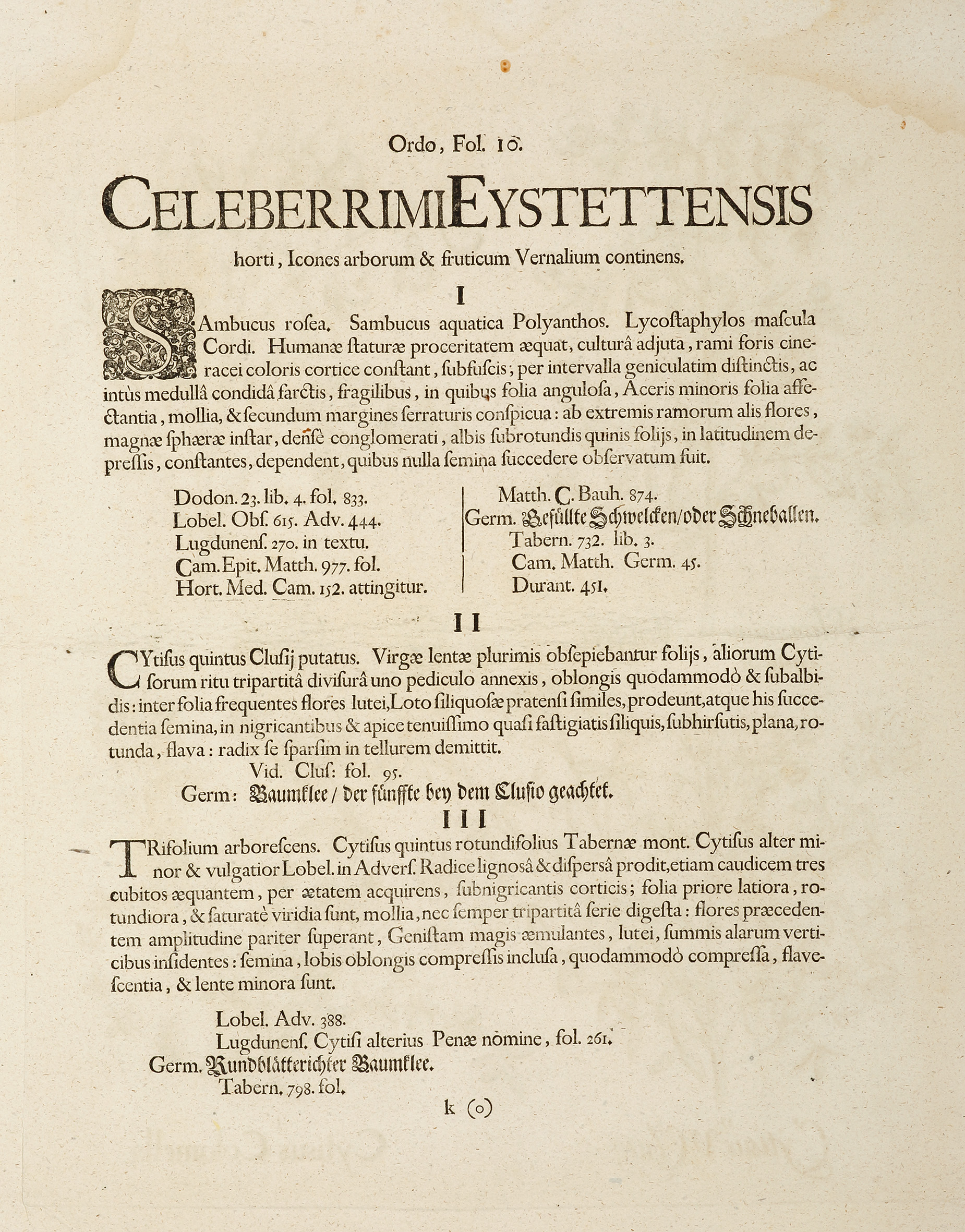 Spectacular botanical engraving from Hortus Eystettensis, the greatest florilegium ever made which recorded all the plants in their actual size which were in the botanical garden developed by the Prince Bishop of Eichstatt in Bavaria. 1. Dorycnium 2. Creeping dwarf broom … Read Full Description