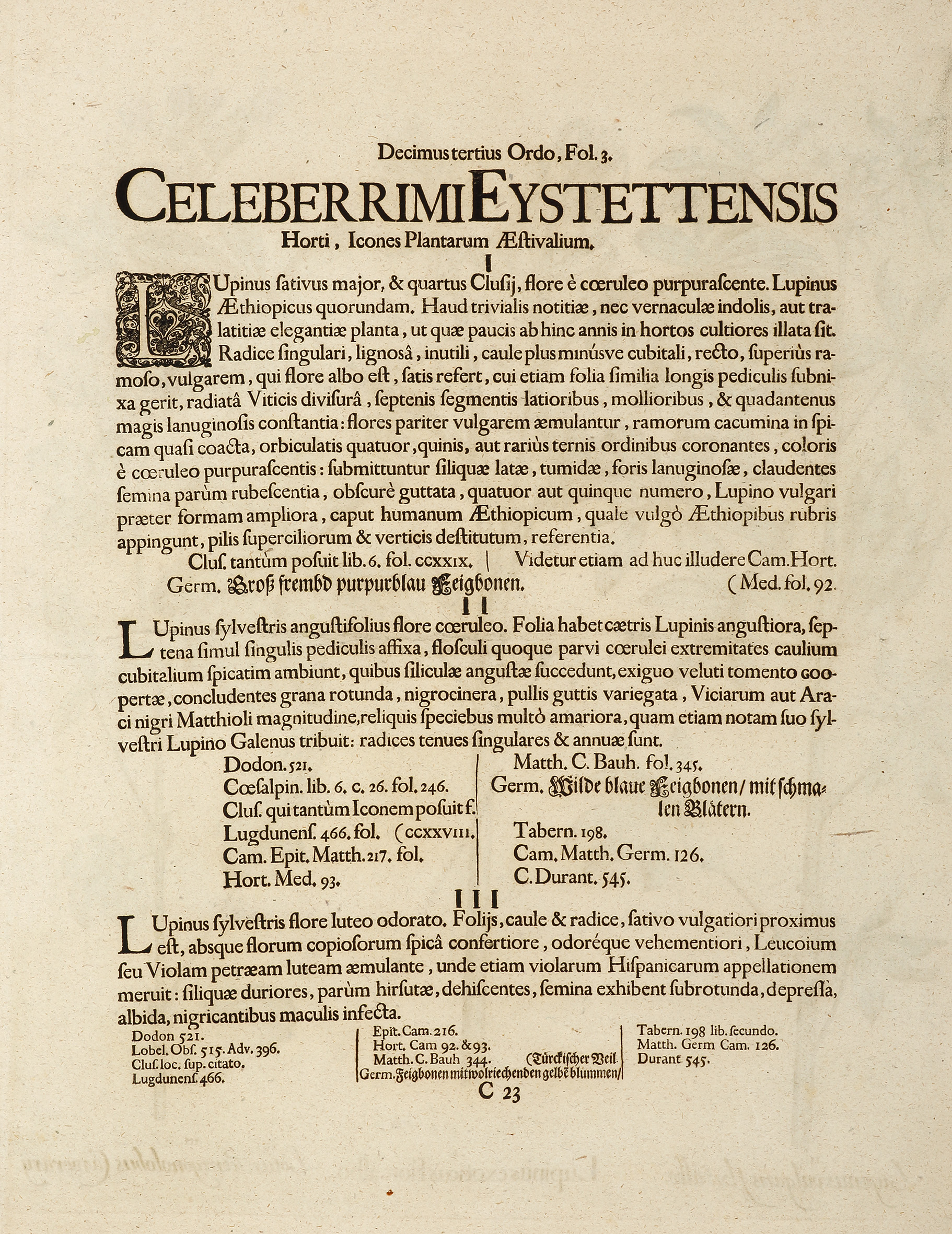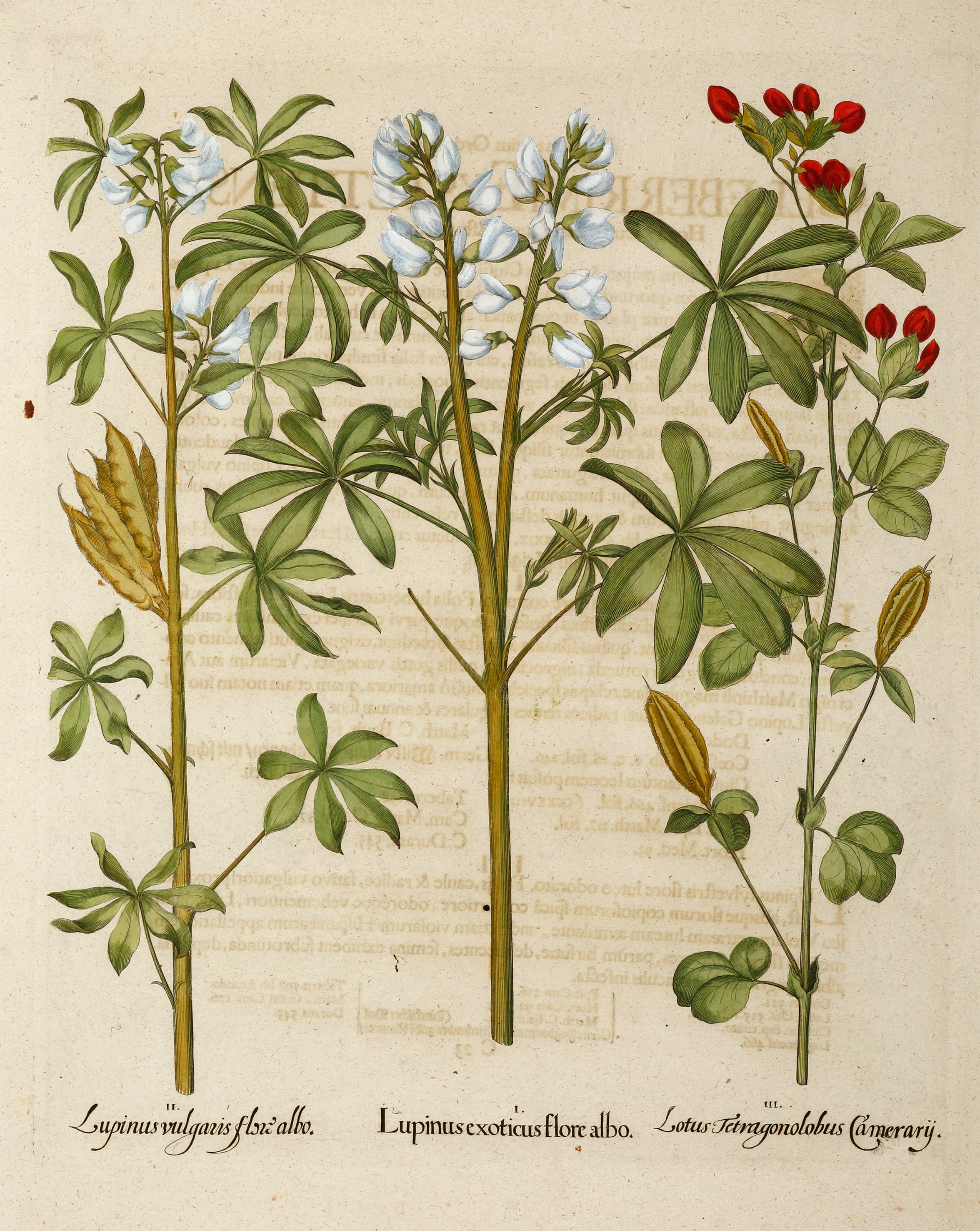 Spectacular engraving of Lupine from Basil Besler’s Hortus Eystettensis, the greatest florilegium ever made which recorded all the plants in their actual size which were in the botanical garden developed by the Prince Bishop of Eichstatt in Bavaria.