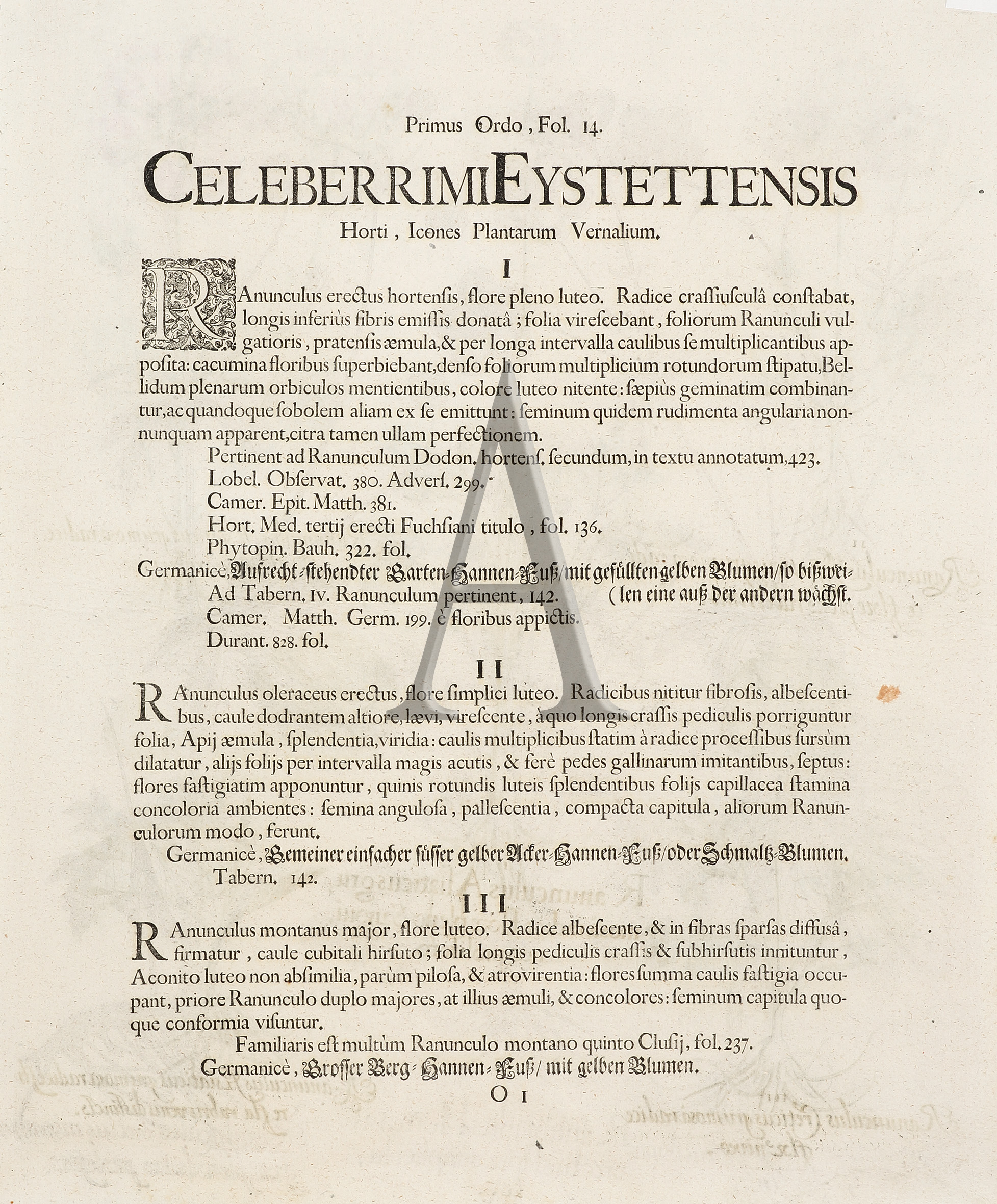 Spectacular hand coloured c.18th engraving of Buttercups from Basil Besler’s Hortus Eystettensis, the greatest florilegium ever made which recorded all the plants in their actual size in the garden of the Prince Bishop of Eichstatt in Bavaria.