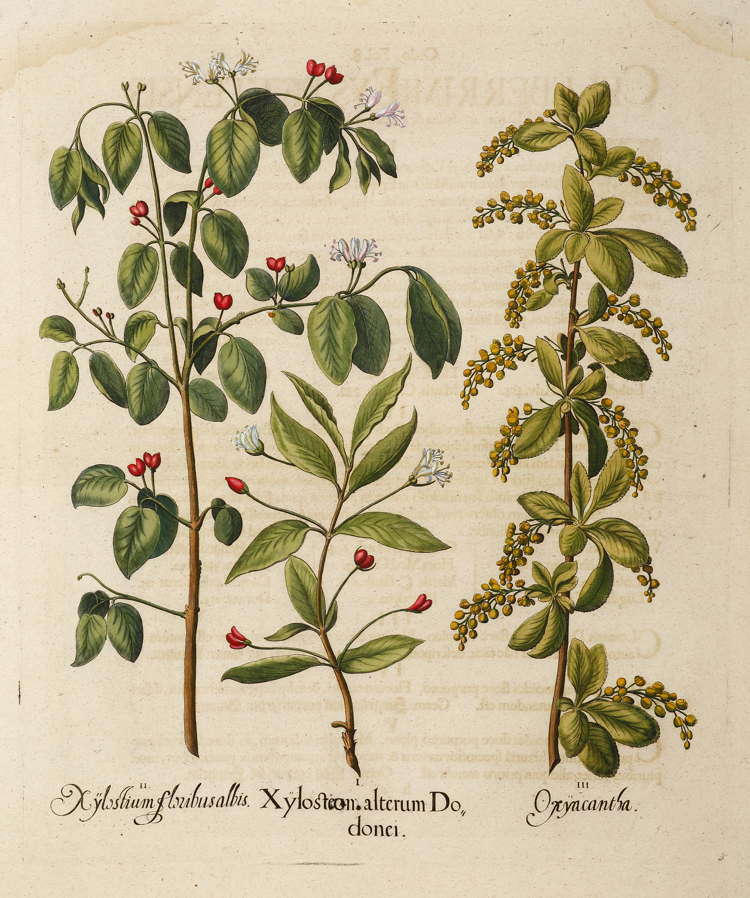 Spectacular engraving of honey suckles from Basil Besler’s Hortus Eystettensis, the greatest florilegium ever made which recorded all the plants in their actual size which were in the botanical garden developed by the Prince Bishop of Eichstatt in Bavaria.