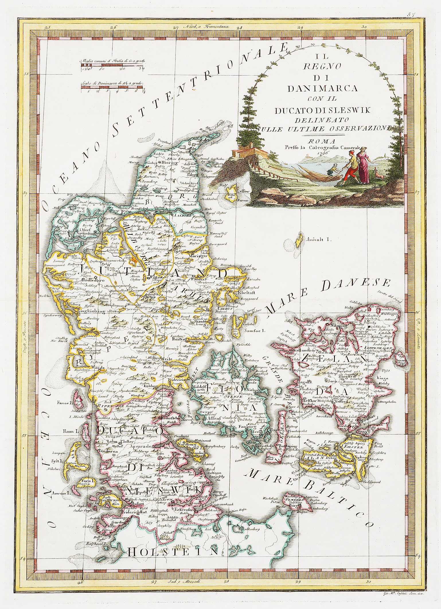 Rare, c.18th hand coloured engraved map of Denmark by the renown Italian cartographer, Giovanni Maria Cassini (1745-1824). The large ornate title cartouche at top right comprises two bowed trees with a group alighting from a small boat. From Cassini, G.M. … Read Full Description