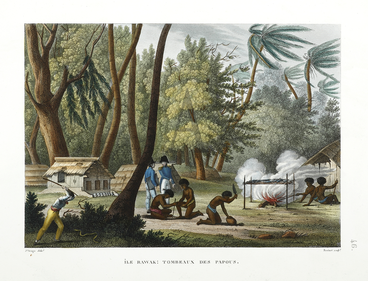 Freycinet anchored at Rawak Island off Papua, New Guinea, on 16 December 1818 and spent some time there and at Waigiou. The expedition had already encountered friendly natives from the nearby island of Gebe, exchanging gifts and dining with them on the Uranie, before the islanders rejoined Freycinet in January 1819 on Rawak to bid his expedition farewell. From Louis Claude de S. de Freycinet’s, “Voyage autour du Monde… Historique”. Note the Historique which contained the topographical views volume was published in 1828. In 1817, he commanded the Uranie, in which Louis Isidore Duperrey, Jacques Arago, Adrien Taunay the Younger and others went to Rio de Janeiro, to take a series of pendulum measurements as well as a larger scheme for obtaining observations, not only in geography and ethnology, but in astronomy, terrestrial magnetism, and meteorology, and for the collection of specimens in natural history. The voyage visited Australia, Mariana Islands, Hawaii, Timor, Guam, New Zealand.