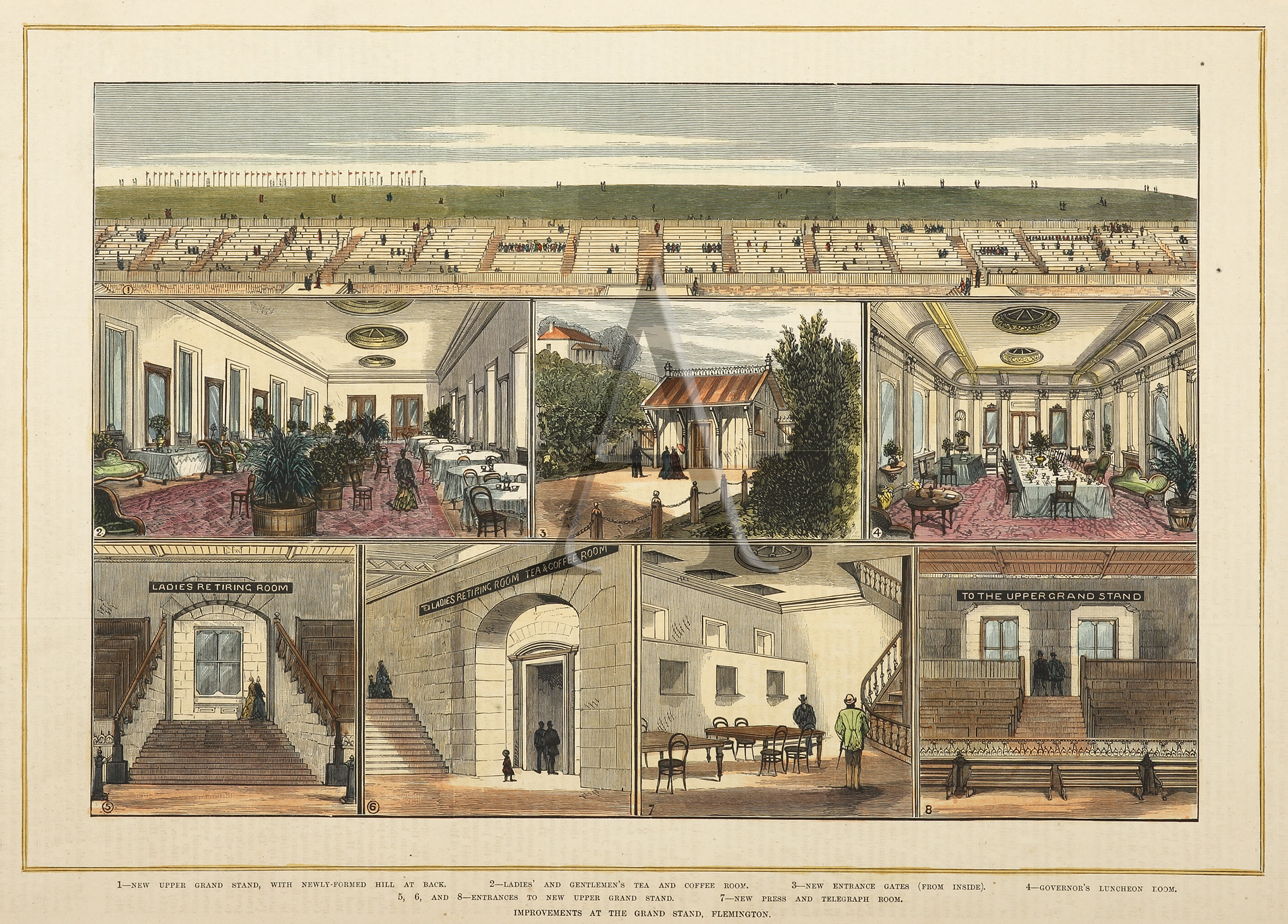1.New Upper Grand Stand, with newly-formed hill at back. 2.Ladies and gentlemen’s tea and coffee room. 3.New entrance gates. 4.Governor’s luncheon room. 5.,6 and 8.Entrance to upper grand stand. 7.New press and telegraph room. From the original edition of the … Read Full Description