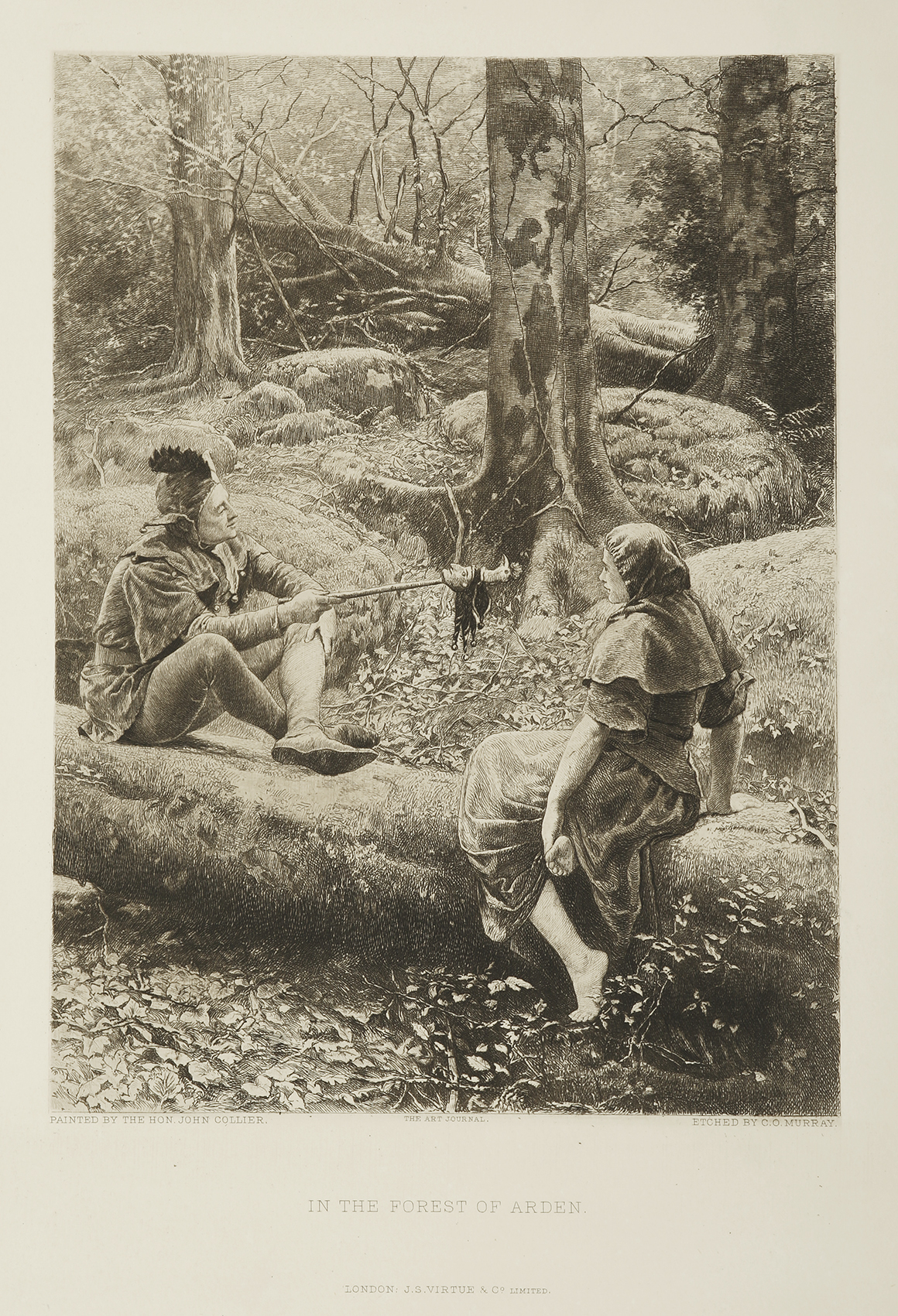 Whimsical scene of two jesters in the Forest from the painting by John Collier adapted from a scene in Shakespeare’s The Forest of Arden, in As You Like It. The play was first performed in 1599, As You Like It presents a revolutionary rural court held in an ancient woodland.