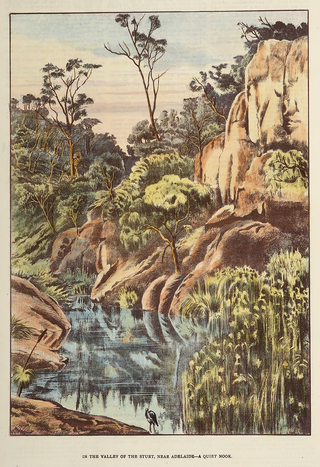 Very rare hand coloured c.19th lithograph of the Valley of the Sturt. From the original edition of Freason’s Monthly Illustrated Adelaide News. Collections: TROVE- Australian libraries, universities, museums, galleries and archives: ISSN 2205-3816