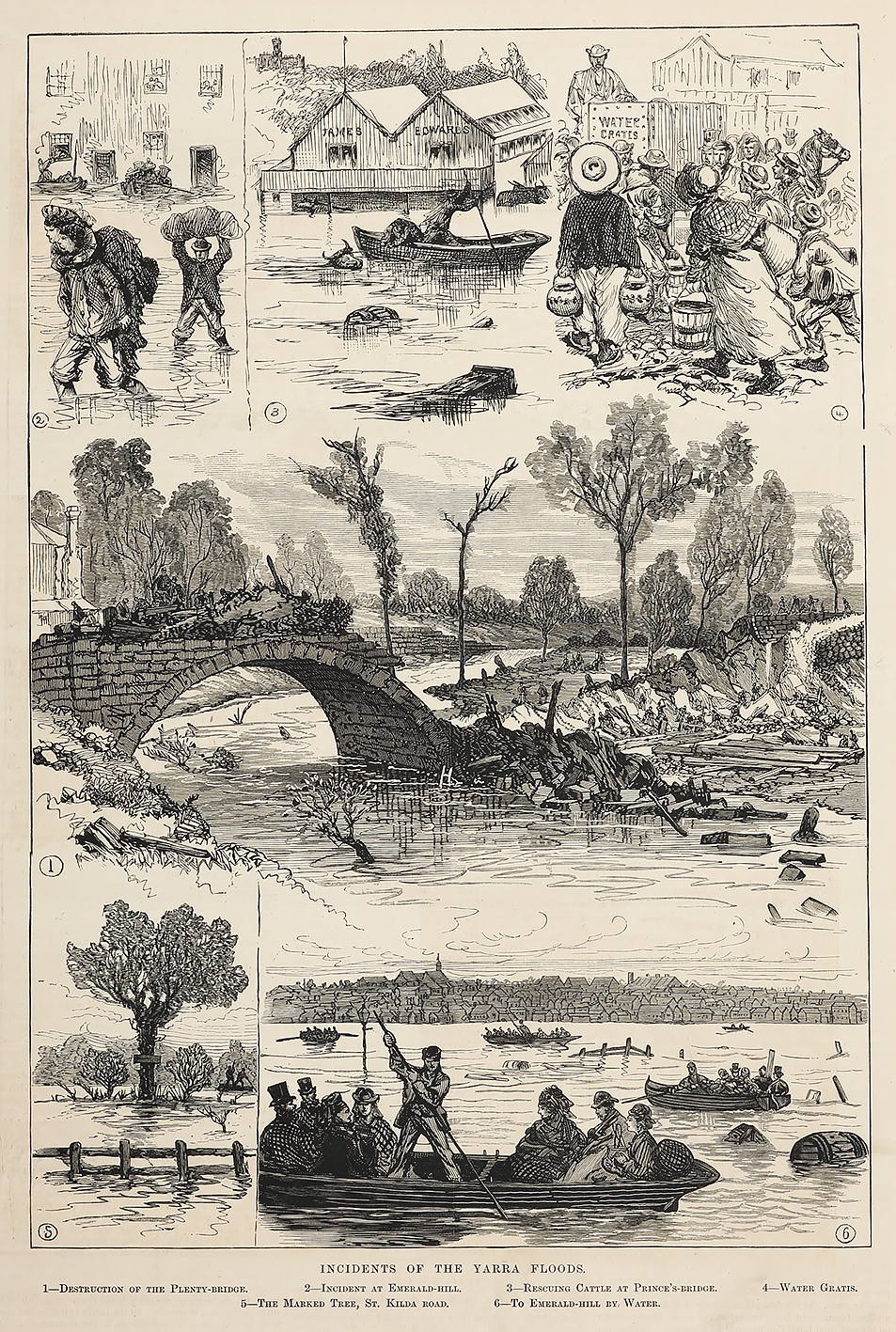 Scarce c.19th hand coloured engraving depicting scenes of the Yarra floods of 1878. Titles of insets: 1. Destruction of the Plenty-Bridge. 2. Incident at Emerald Hill. 3. Rescuing Cattle at Prince’s Bridge. 4. Water Gratis. 5. The Marked Tree, St.Kilda … Read Full Description