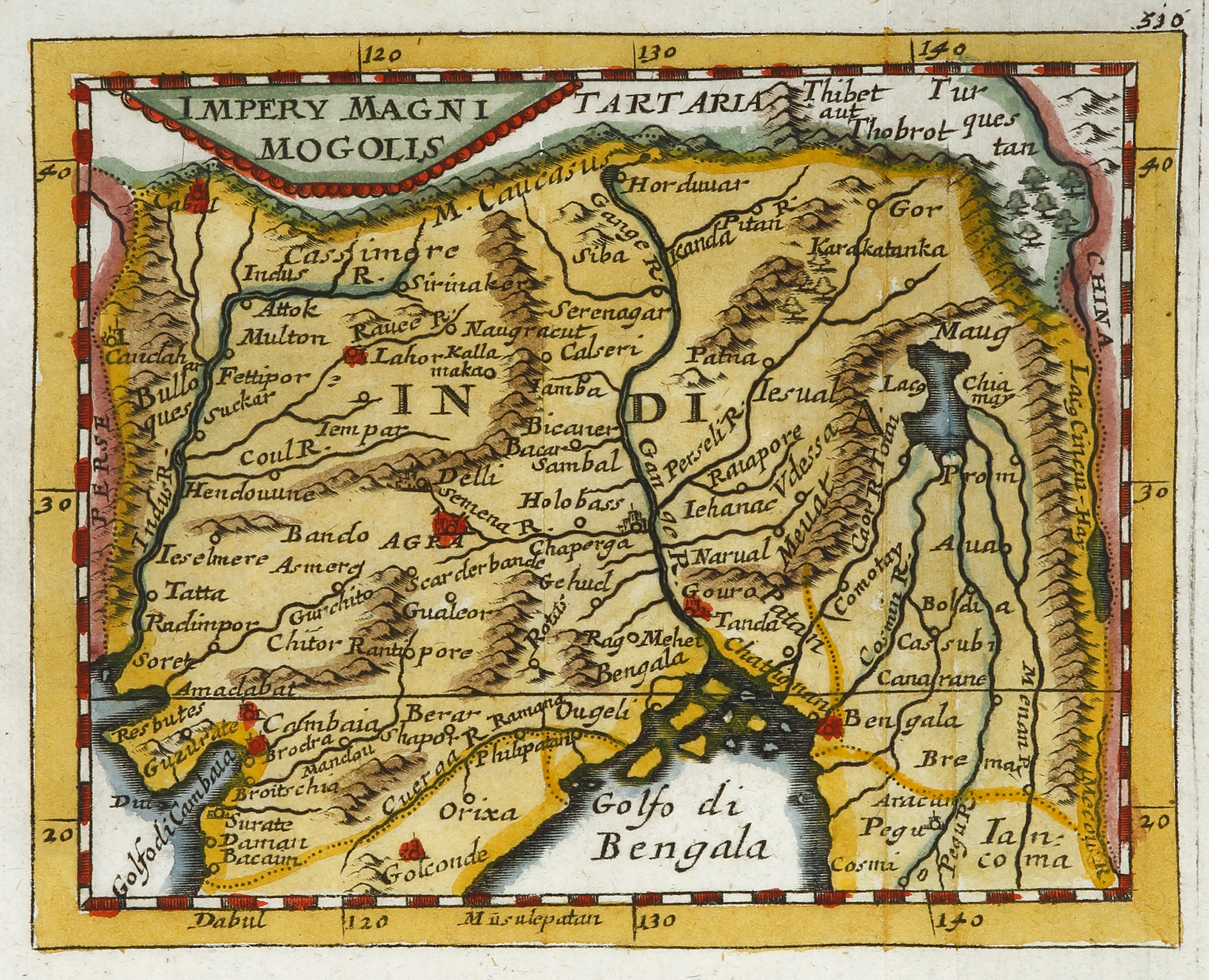 Rare early miniature map of northern India extending to Tibet by Pierre Duval. German edition published by Johann Hoffman. From Duval, Geographiae universalis pars prior, Nuremberg MDCLXXXI (1681).