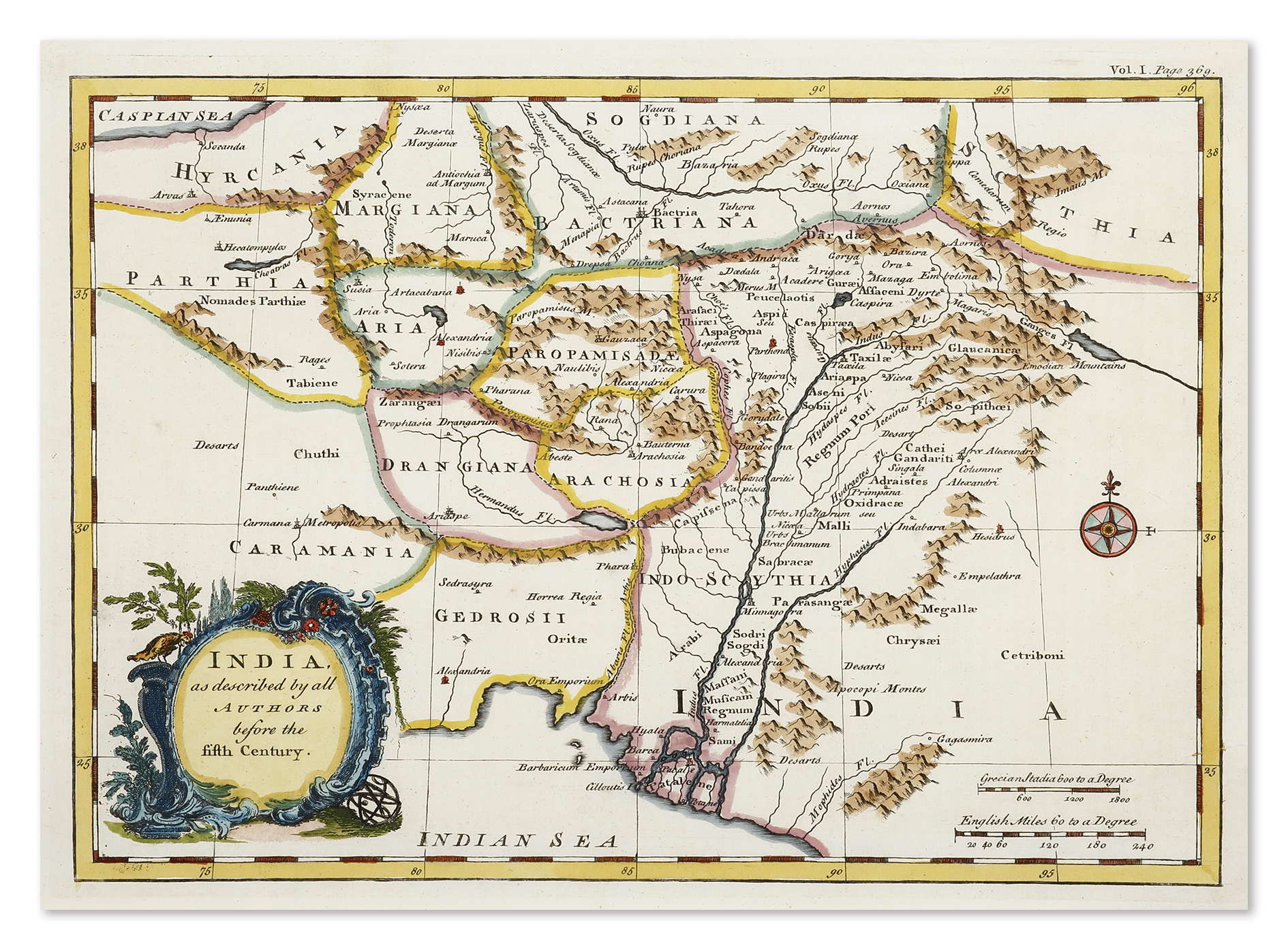 C.18th map of India as it was known pre C5th. The map extends from Hyrcania in present day Iran, Scythia in the north east, a region of Central Eurasia in classical antiquity, occupied by the Eastern Iranian Scythians and south to Patalene at the mouth of the Indus River.