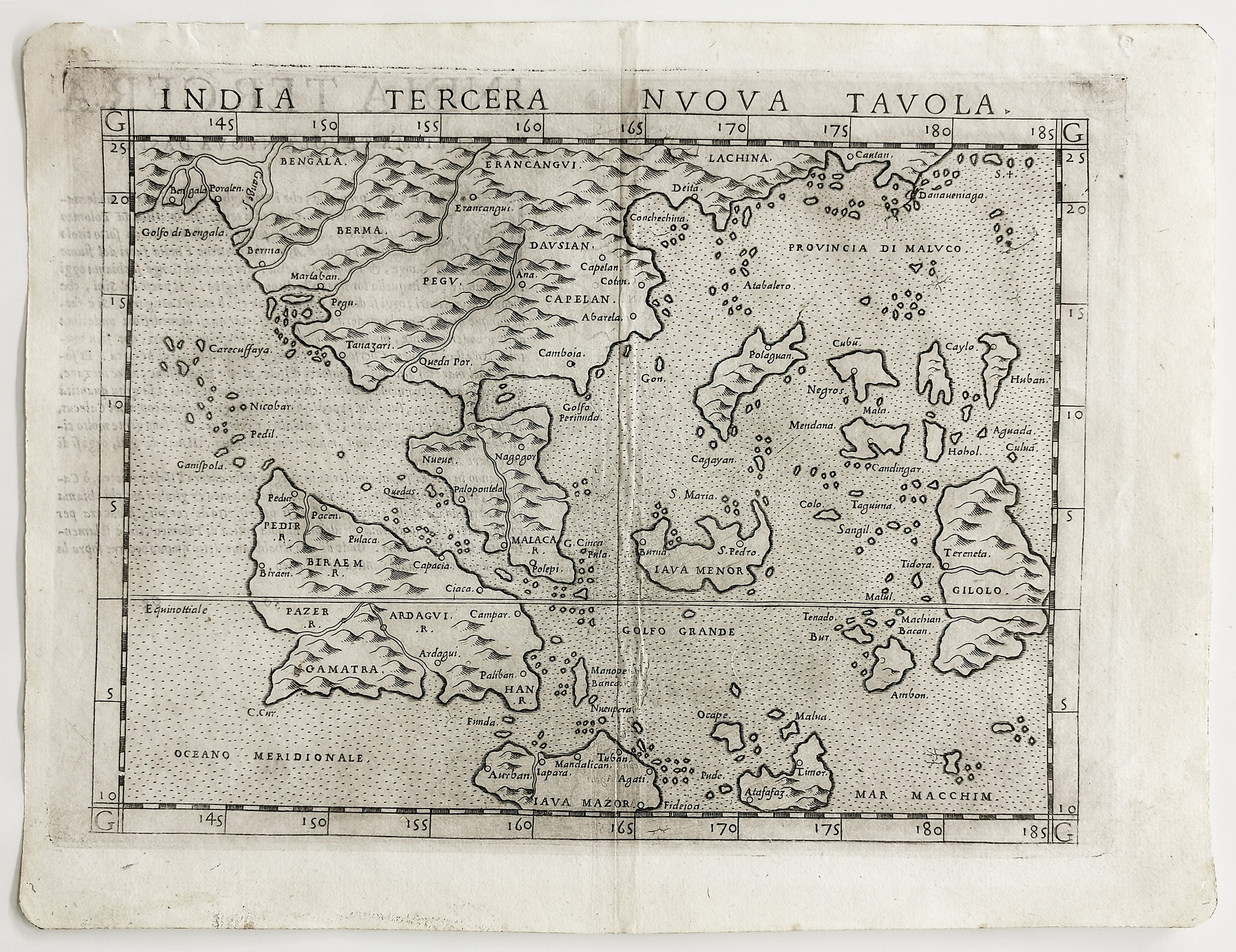First edition of Girolamo Ruscelli’s c.16th map, India Tercera Nuova Tavola, is one of the earliest modern maps of Southeast Asia.