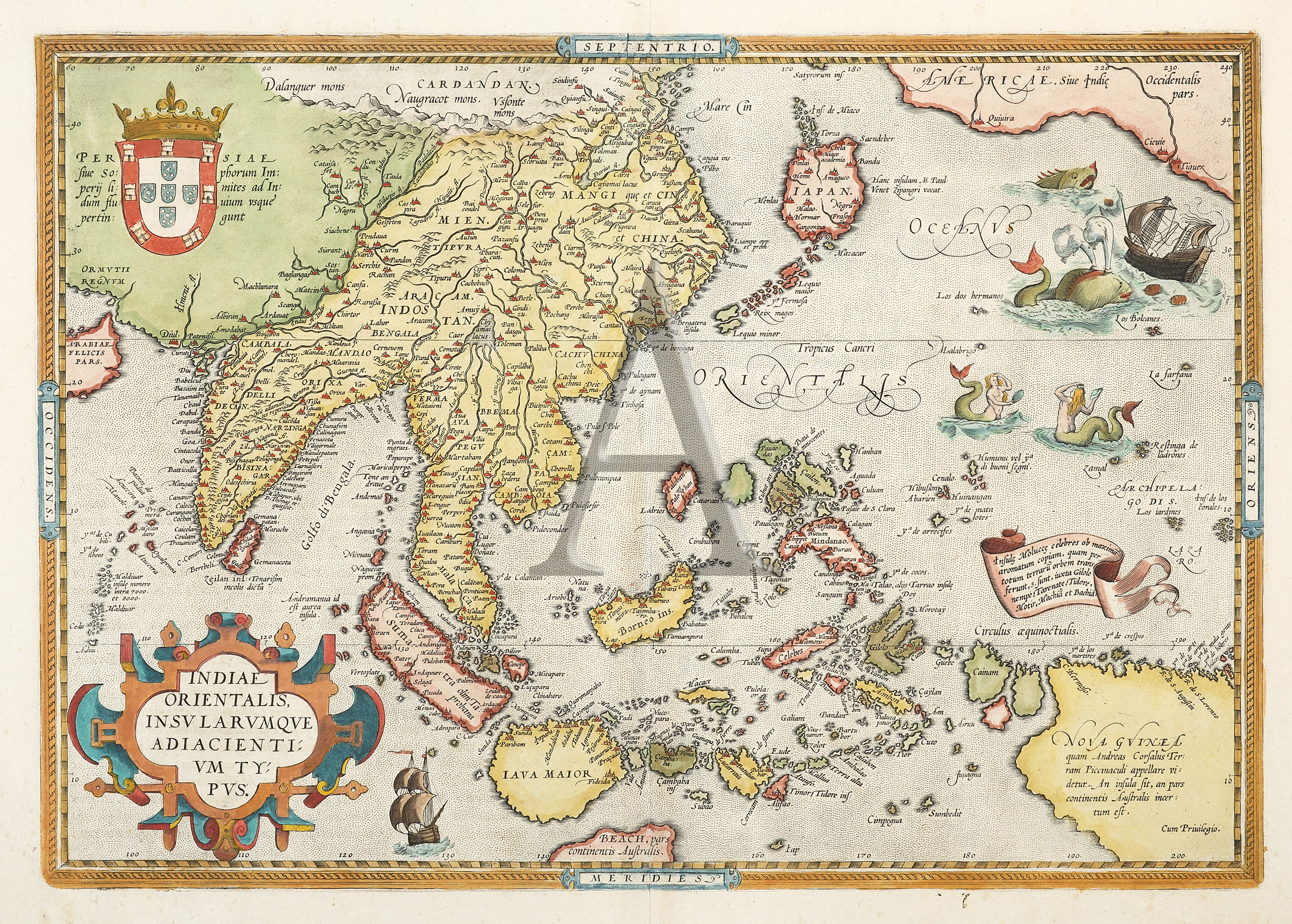 Ortelius was the first to separate ancient and recent geographic knowledge in his maps and to indicate the changes from the old nomenclature to the new. Superbly embellished with a pair of frolicking mermaids, galleons, sea monsters, a crest and decorative strapwork title cartouche engraved by Frans Hogenberg (1539-1590).