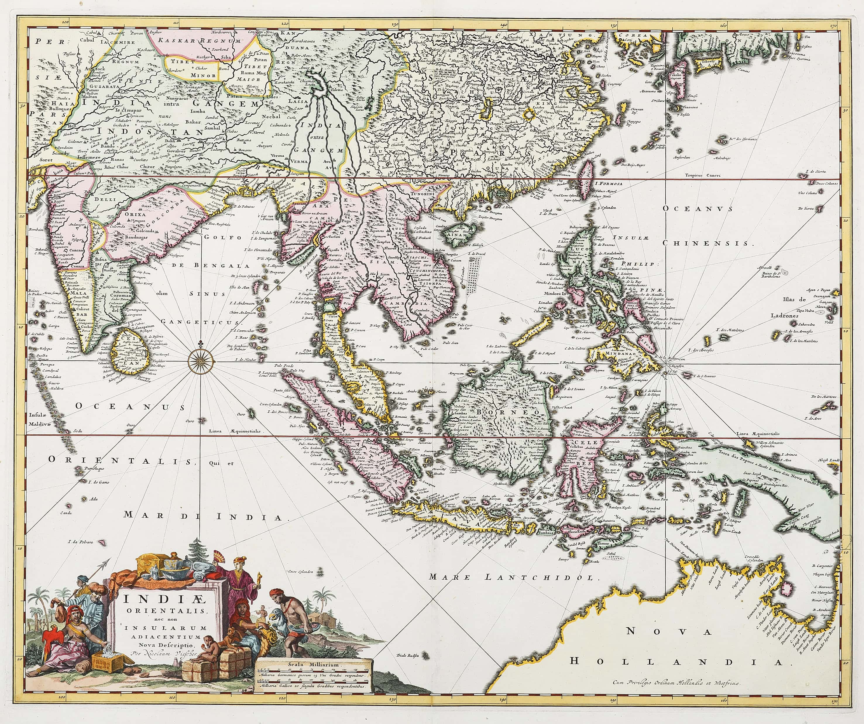 Superb Dutch c.18th hand coloured engraved map of the East Indies by Nicholas Visscher I. This issue of the map is after Visscher was granted privilege in 1677 as shown on the lower right. The map extends from India to … Read Full Description